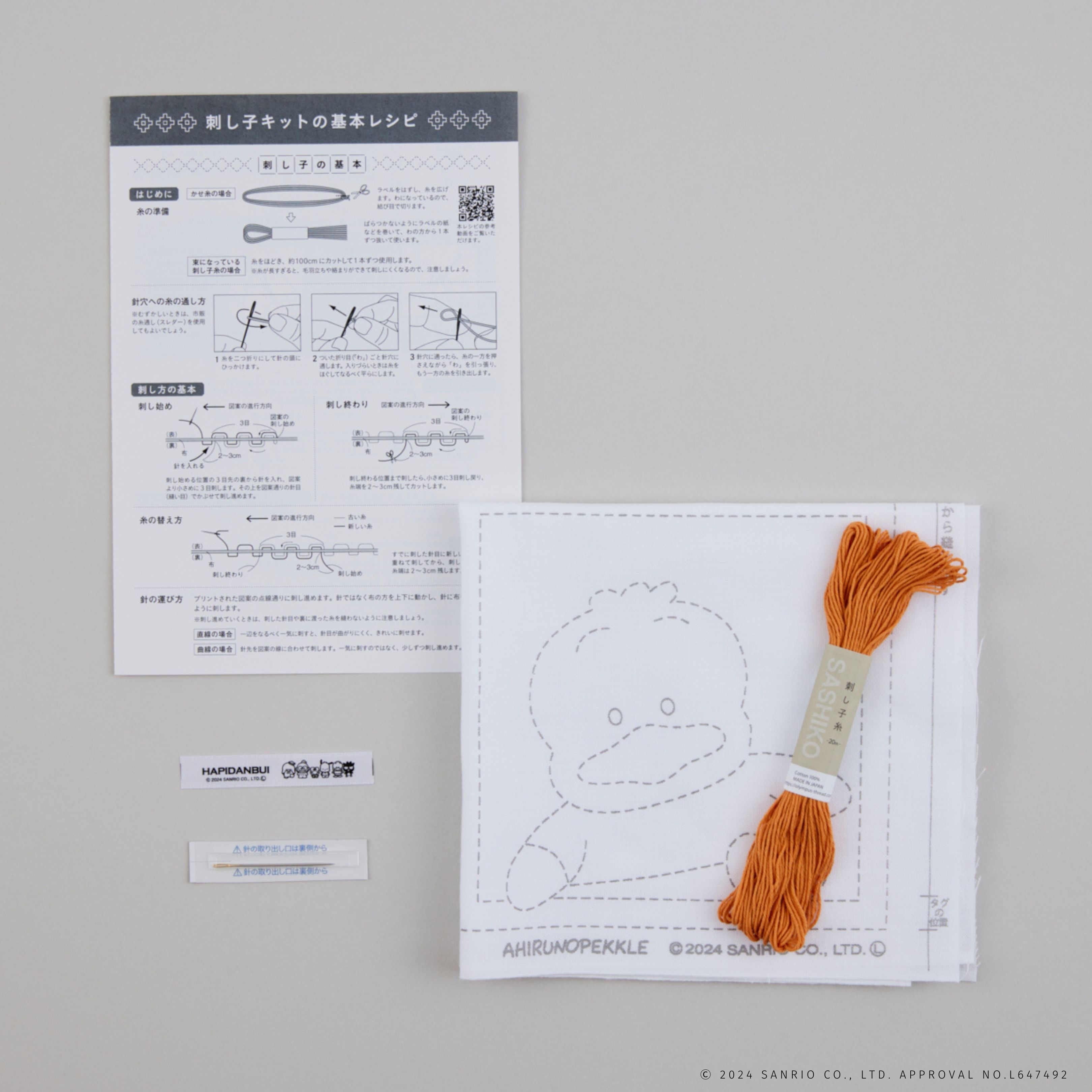 キットには図案の刺し方図とは別に「刺し子の基本レシピ」がついてきます。針への糸の通し方からきれいに刺すコツ、作品の仕立て方まで、イラスト入りでていねいに解説しています。また、つまずきやすい刺し始めや運針の手順にはポイントレッスン動画をご用意。疑問点をクリアにして刺し進めることができます。
