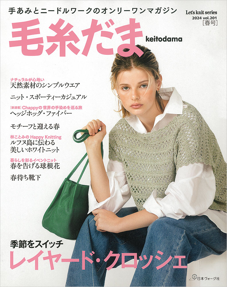 巻頭特集は「レイヤード・クロッシェ」流行中のかぎ針ウエアを、春先から初夏まで長く楽しめる、実用的な重ね着アイテムとしてご提案します。第2特集はモチーフ。春らしい花モチーフを中心に、人気の続くモチーフつなぎのウエアと小物をご紹介。その他、天然素材のシンプルなウエアや、スポーツテイストのカジュアルウエア、根強い人気の靴下、ショールなど、季節に合わせたおしゃれな手編みアイテム満載でお届けします。