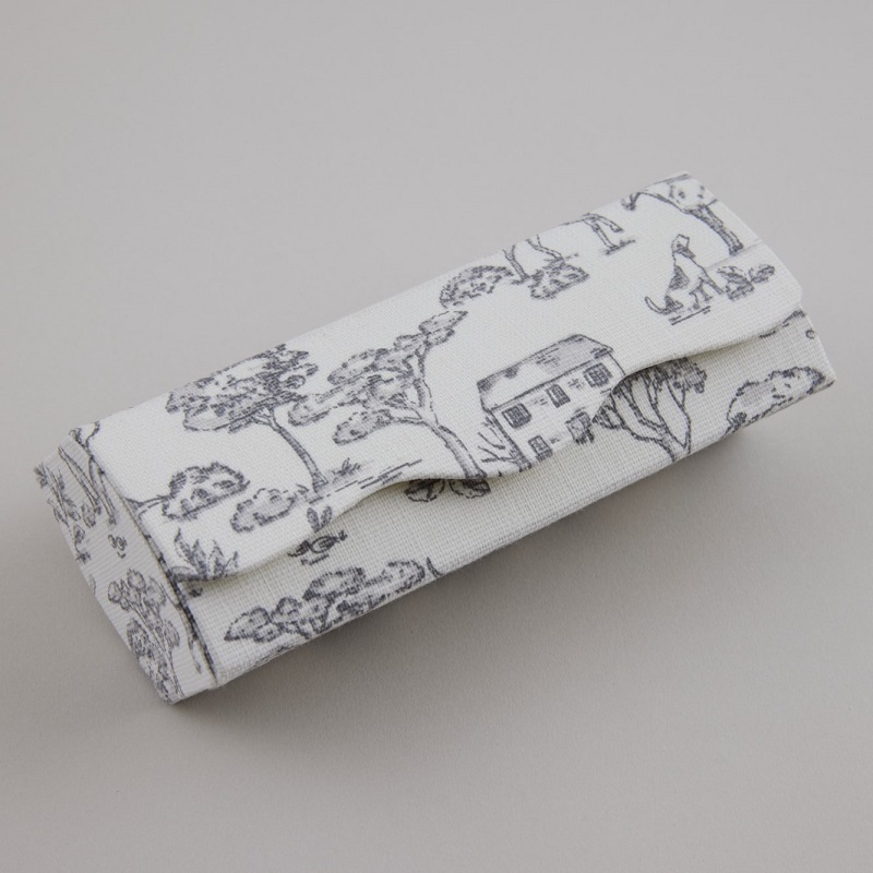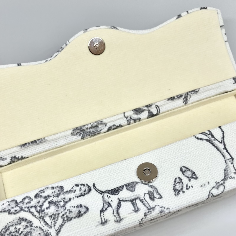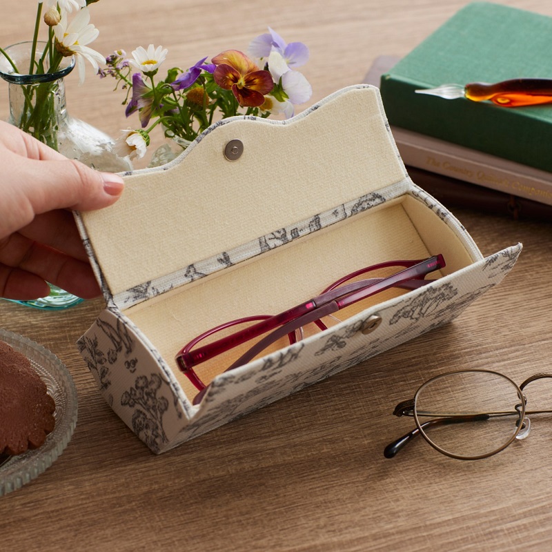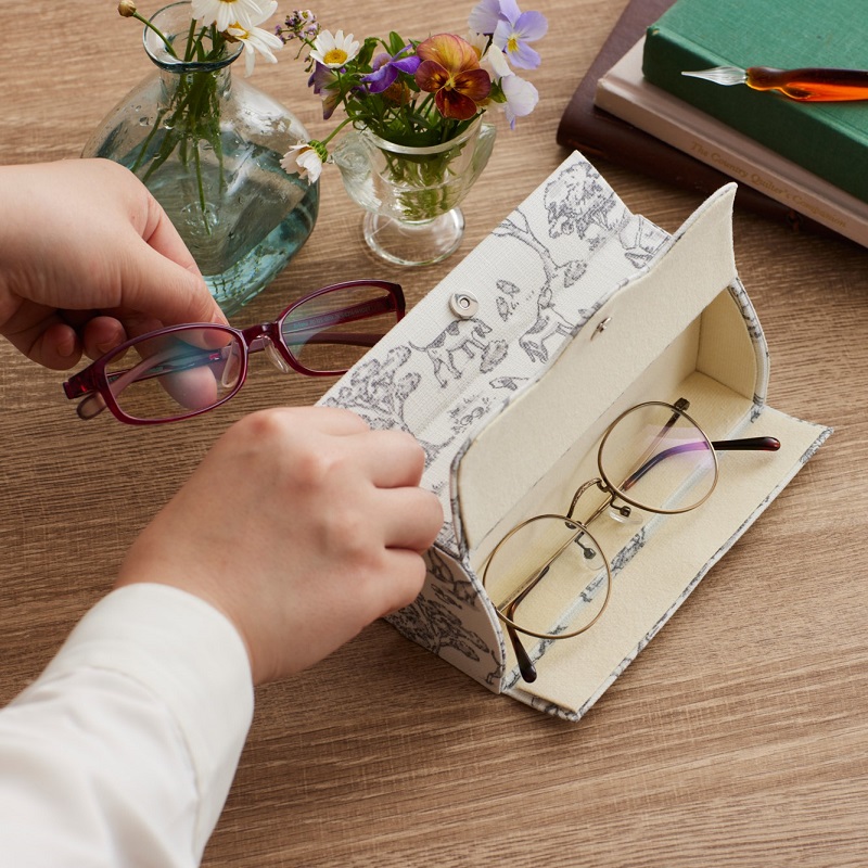 一つは日常使いのメガネ、もう一つは特別な場面に使い分けることができます。 メガネを使わない方はペンなどの筆記用具を入れられます。 厚紙は白いものを使用しているので白い生地でも本来の色を活かすことができます。デザインはシンプルなので多様な生地との組み合わせが楽しめます。