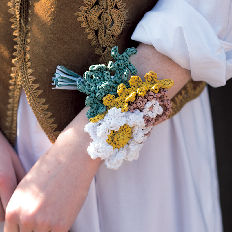 春の歓びを詰め込んだ、花束みたいなバッグ。モスグリーンの方眼編みのベースに、大小様々な花々とベリーを飾りました。全10色の糸を組み合わせた絶妙なカラーリングも編み応えがあります。お揃いのブレスレットも素敵でしょ?