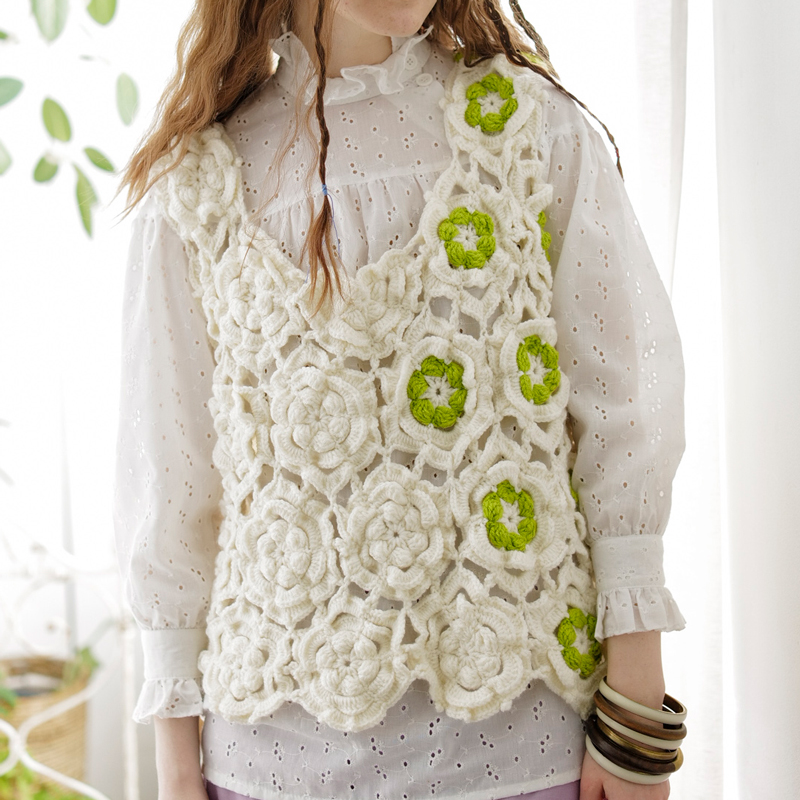 立体モチーフの配色の仕方が新鮮で、インパクトのあるデザインです。存在感のある大柄な花モチーフを合わせたアクセサリーのようなベストは、モチーフを編んでつないだらできあがり。すぐに着て、お出かけできます。