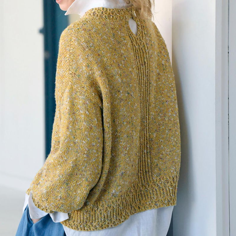 ラフなスタイルをハイクオリティーな素材で編むのも大人のニットスタイルの醍醐味。シルク100%の糸とスラブ調の風合いが素敵なコットン&リネンの混紡糸を引き揃えた、シルク特有のシャリ感とリネンの張りが楽しめるバルーン袖のウエアです。レリーフのようにあしらわれた1目交差も素敵です。