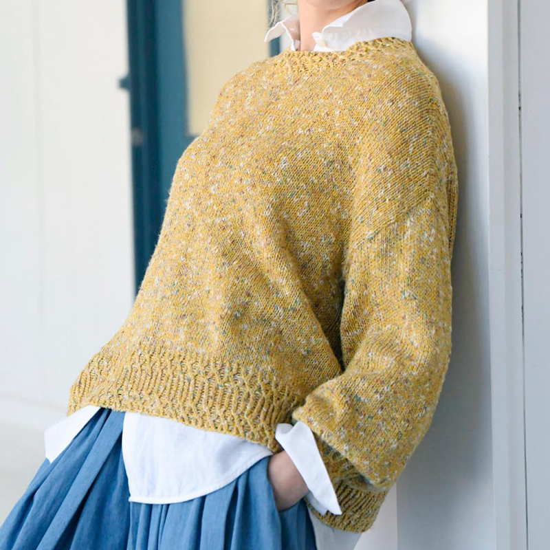 材料:ておりや Tシルク 黄(11)270g。コットンリネンKS 黄系ミックス(01)190g。直径18mmのボタン1個。
