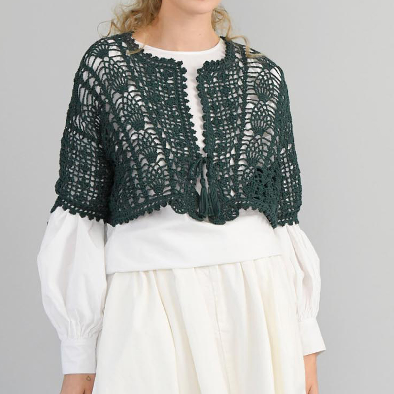 ショートボレロはパイナップル模様を縦にあしらって すっきりと見せます。裾に丸モチーフをプラスして楽しげに仕上げました。
