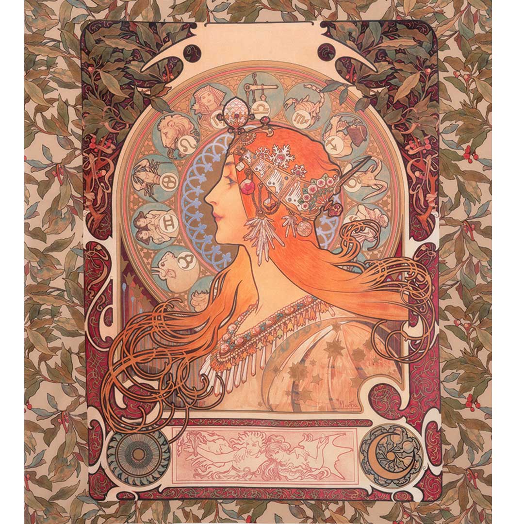 [デジタルプリント][シーチング] カレンダー用に描かれたミュシャの代表作「黄道十二宮」を、インクジェットで繊細に再現したパネル生地です。そのまま飾っても、キルティングをしてタペストリーに仕立てても。