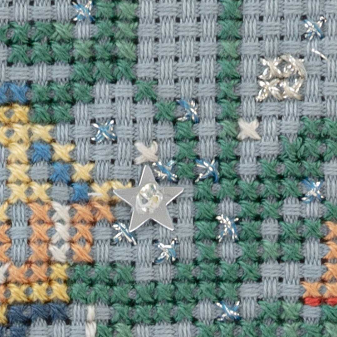 綿の刺しゅうクロス(14カウントジャバクロス/ブルー)、刺しゅう糸、ラメ糸、ビーズ、スパンコール、フレーム、木のバー、ボール紙、針、糸通し