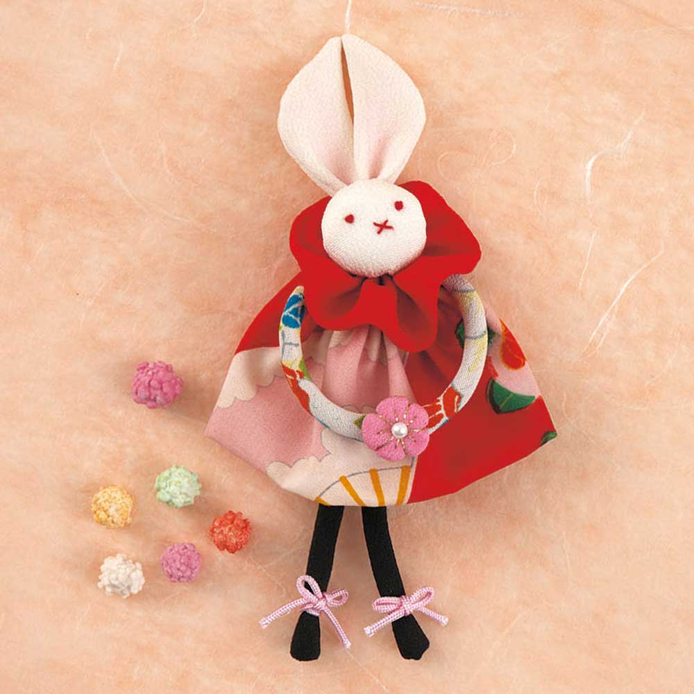 【古裂】【キット作り方つき】フリルカラーのドレスでおめかししたウサギのブローチです。縁起物としても人気なので、お守りや魔除けとしてバッグなどにつけても。