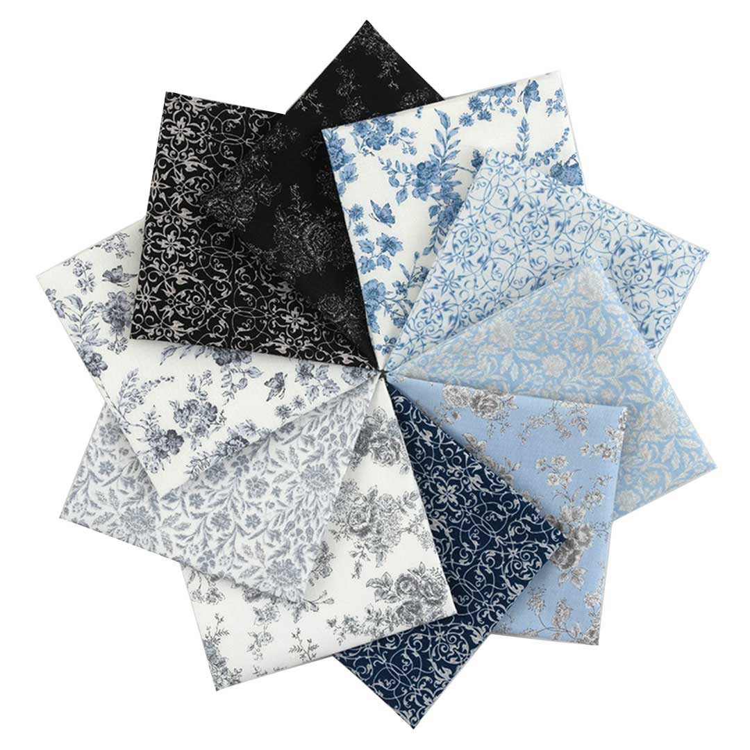 草花や小鳥、ダマスク柄をブルー&グレーでシックにまとめたカットクロスセットです。小物作りやパッチワーク、カルトナージュなど様々に使えます。