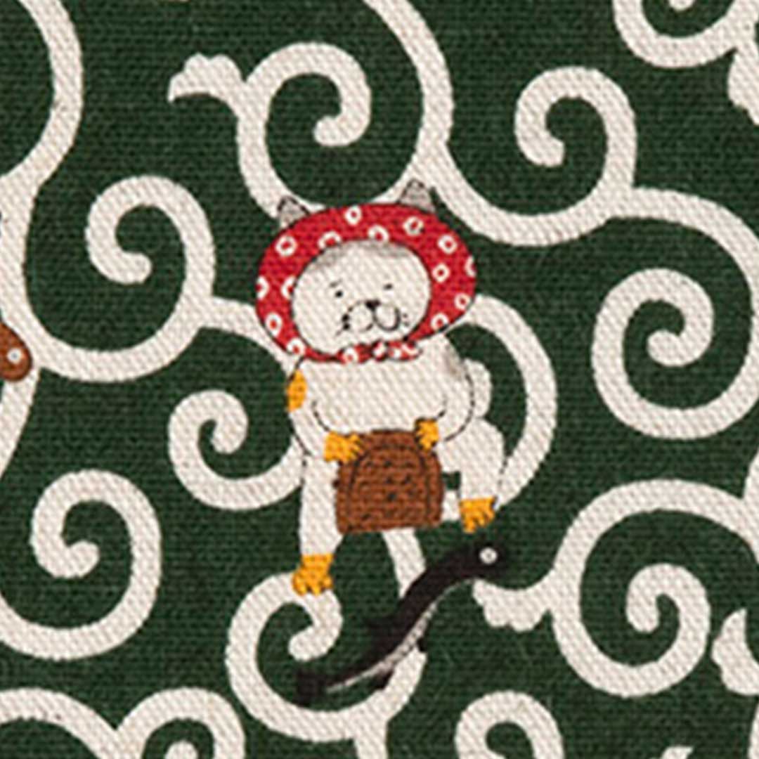 【綿麻キャンバス】唐草模様とドジョウすくいをするネコの組み合わせがユニークなプリント布。ポーチやバッグなどに向いた、やや厚手の綿殻入りキャンバス地です。