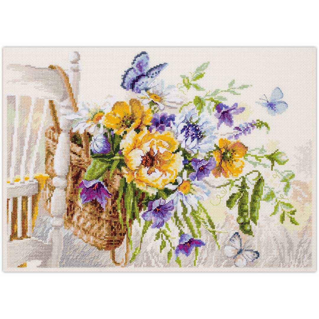 【キット作り方つき】バスケットから溢れる、黄色や紫の花々のクロスステッチ作品です。ナチュラルなグリーンを添えて爽やかに。上級の方向き。