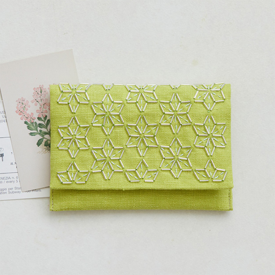 刺し子の伝統模様をビーズ刺しゅうで楽しむ「ビーズ刺し子」。印刷済みの図案線に沿って一針一針ビーズを通しながら刺していくと、刺し子の伝統柄が美しく浮かび上がります。