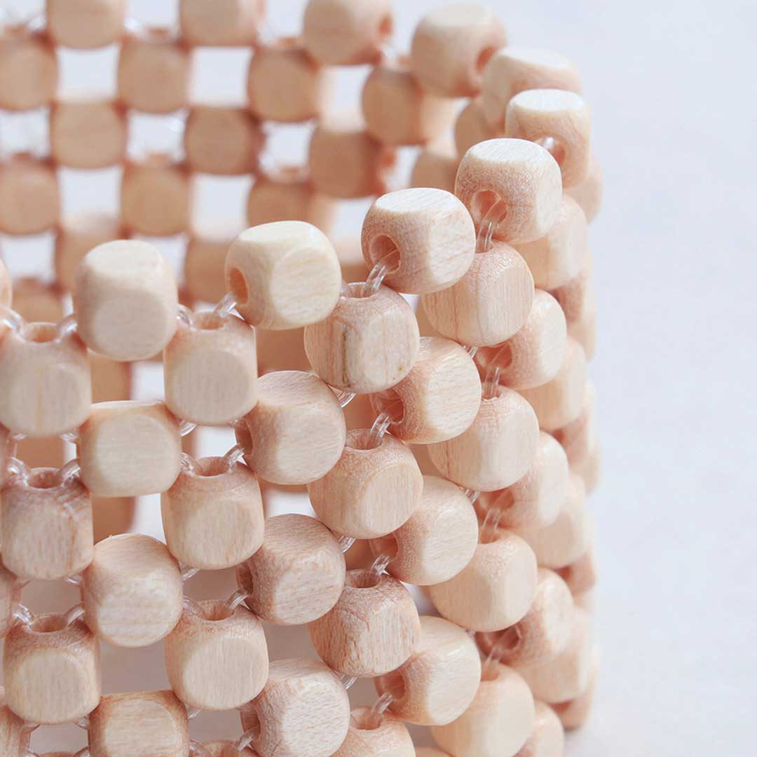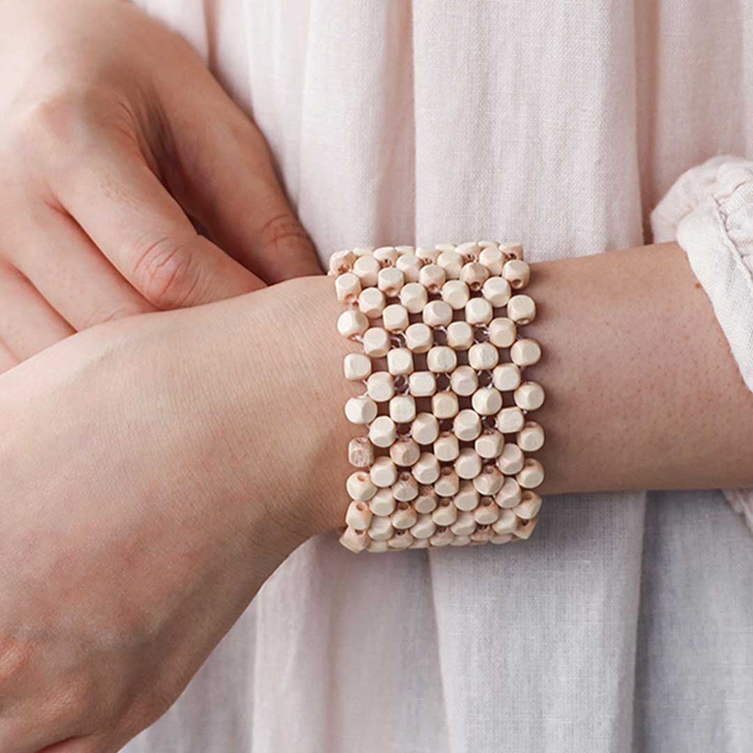 【キット作り方つき】 ウッドビーズと伸縮性のあるコードで作る、ナチュラルカラーの幅広ブレスレット。シン プルな編み方で金具なども使用しないため、初めての方や気軽な手作りにお勧めです。