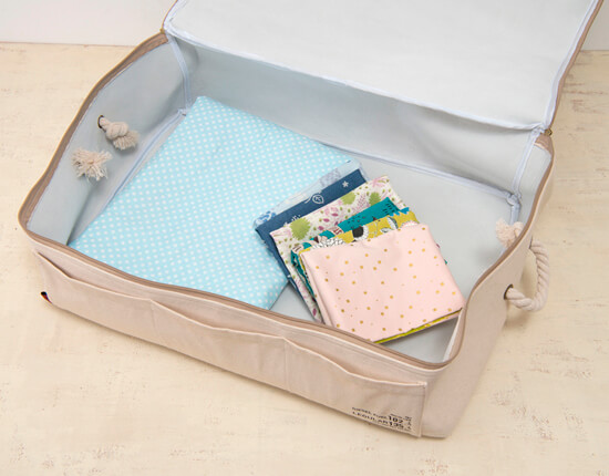 限定50 カットクロスなど布の収納におすすめのケースです。ハンドルつきで持ち運びも便利。側面や蓋裏のメッシュのポケットも活用できます。シンプルなデザインなのでリビングに置いておいてもおしゃれ。内側はコーティングが加工がされているので汚れにくいです。