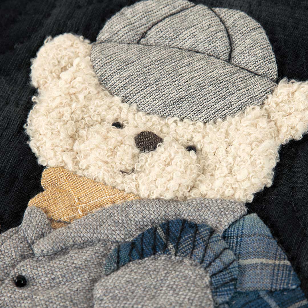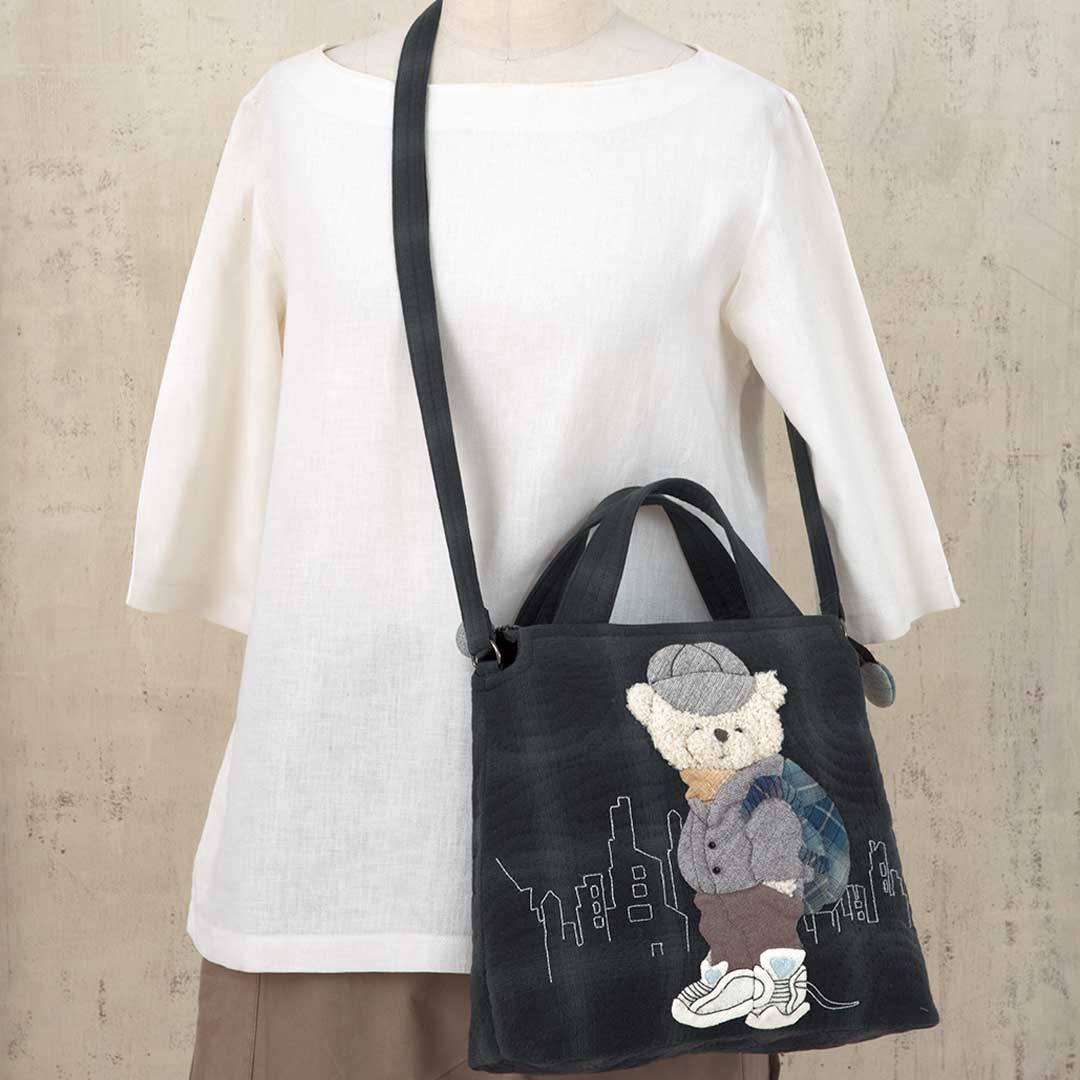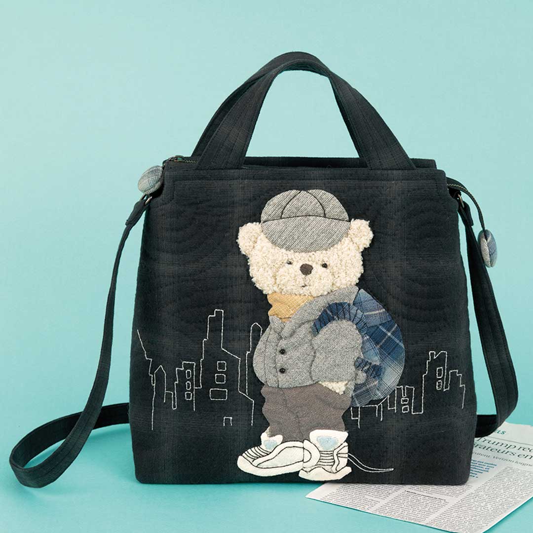 【キット作り方つき】少年が夜の待ちへ出掛ける風情をテディーベアで。顔はボアの布でアップリケします。後ろ側は1枚布です。