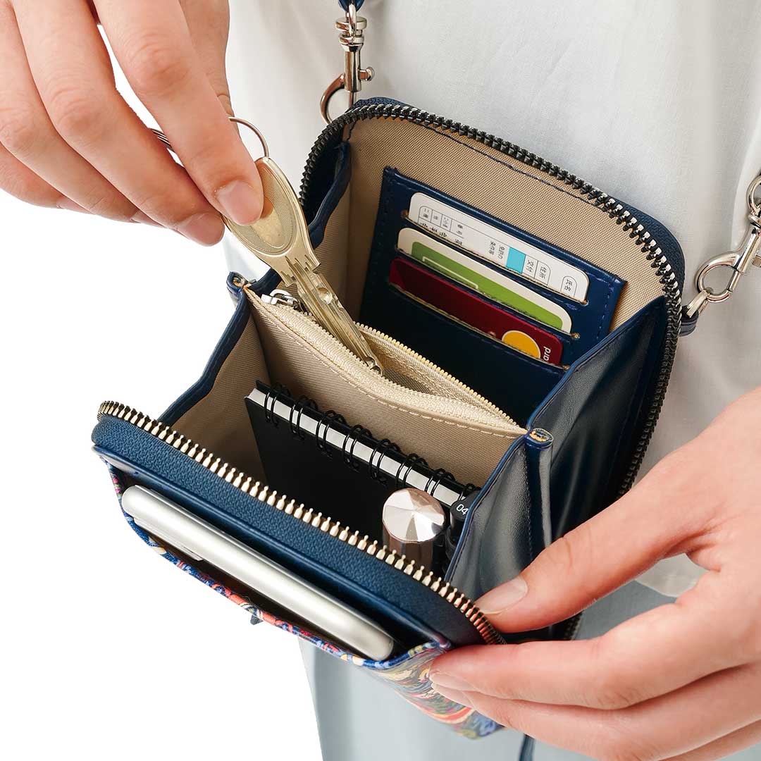 【完成品】スマートフォンや鍵、カードなどをコンパクトに収納できるポシェットです。散歩や旅行に重宝します。