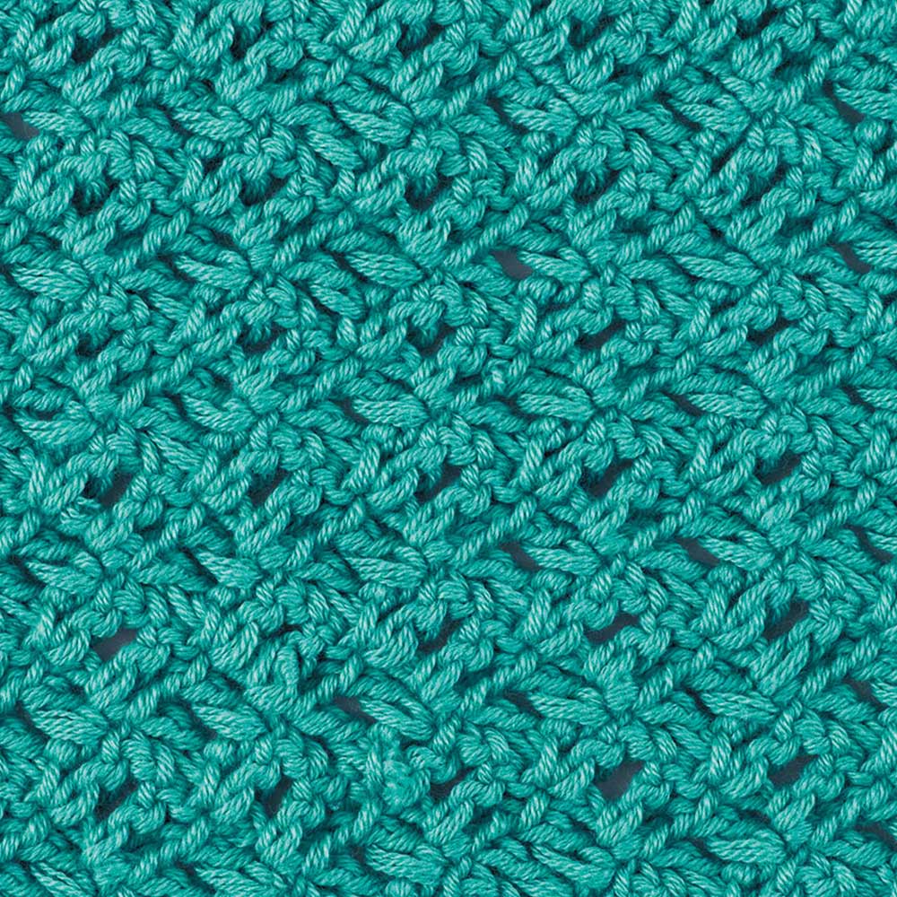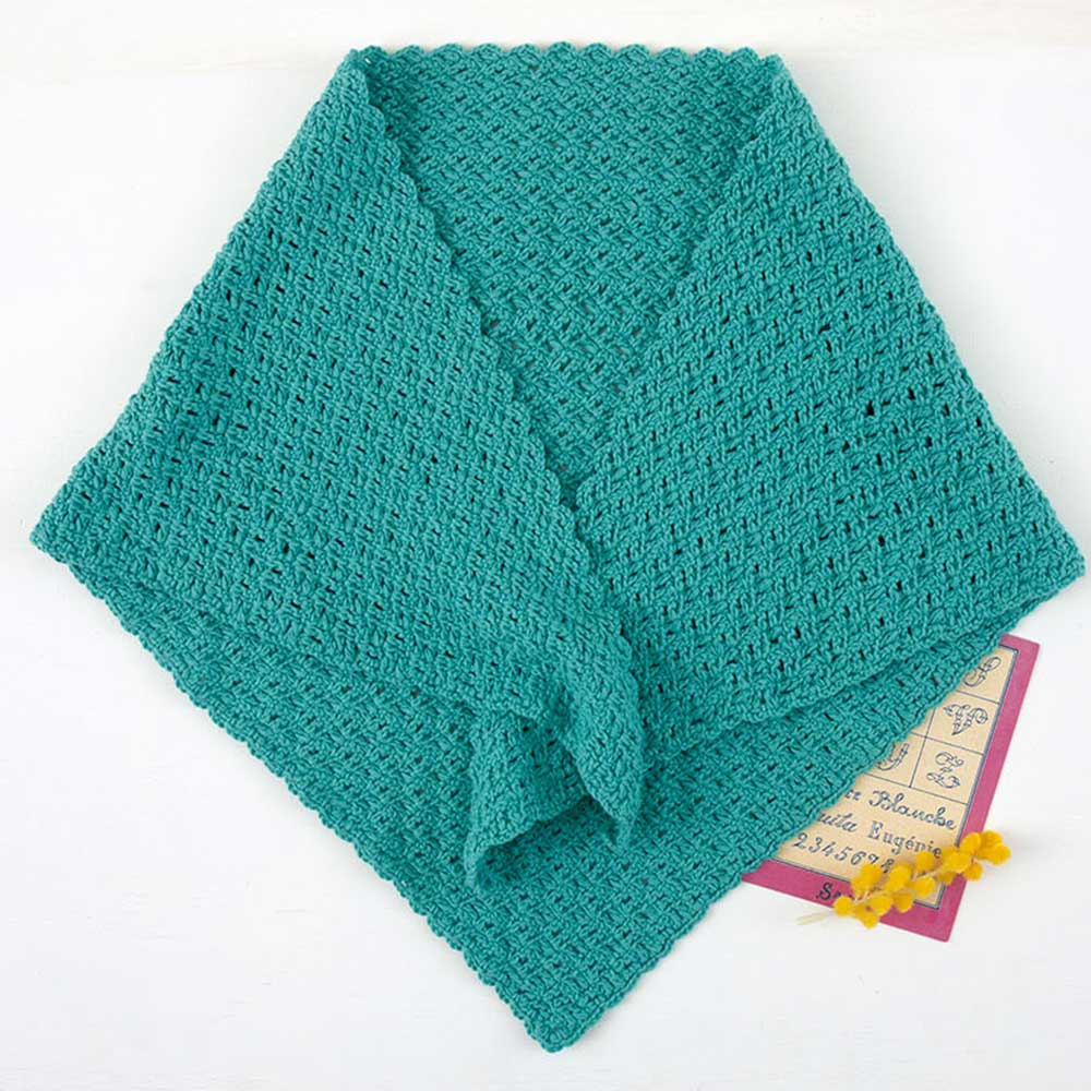 【キット作り方つき】小さめスカラップで甘さを抑えた、カジュアルにも合わせやすい三角ストール。爽やかなターコイズグリーンが顔周りを明るい印象にしてくれます。中級以上の方にお勧めです。