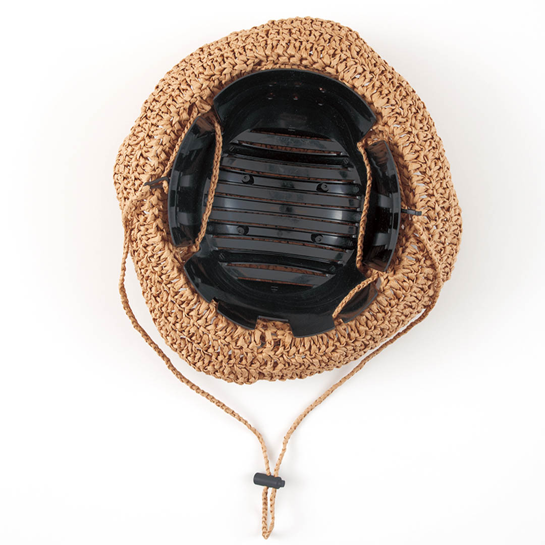 【キット作り方つき】努力義務となった自転車用ヘルメットにかぶせる、麦わら風のニット帽。柔らかな風合いの天然素材で編み、セットになっているヘルメットを内側に装着します。通気性もよく、爽やかなかぶり心地で濯もOK。中級以上の方に。