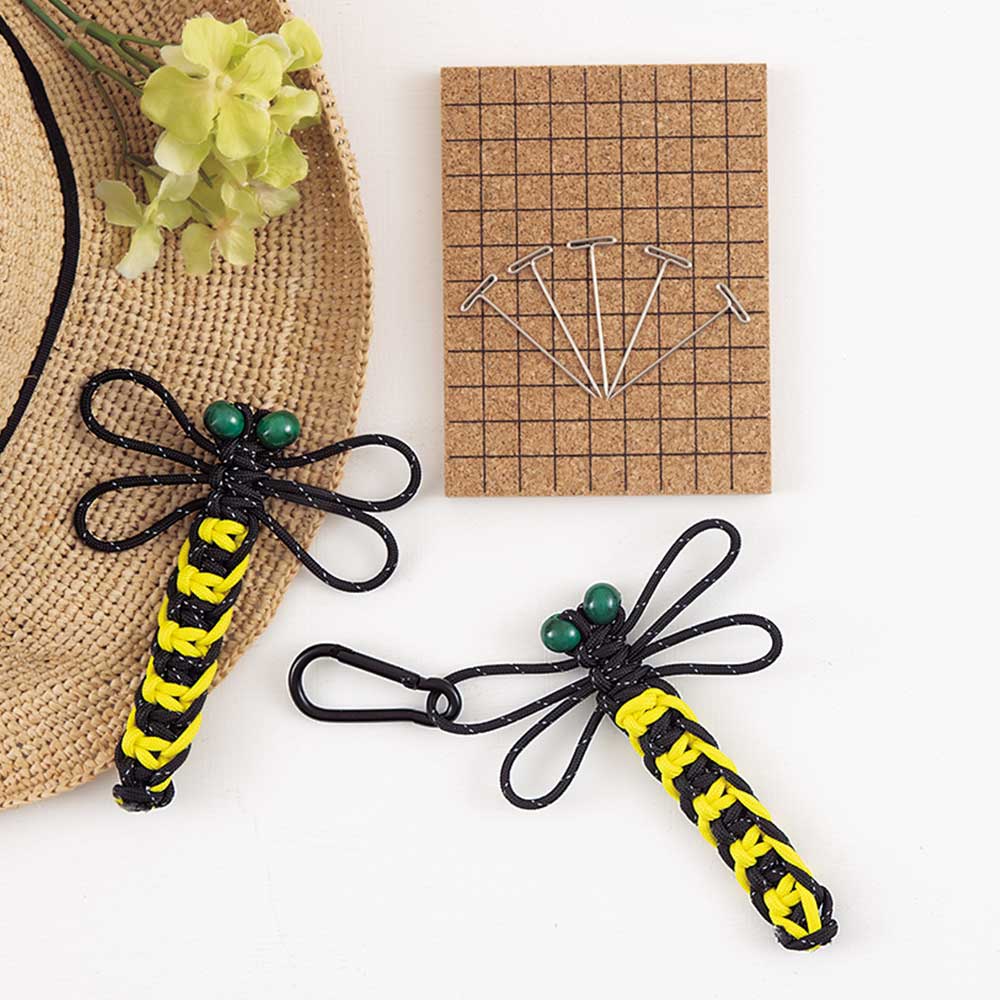 【キット作り方つき】カやハエ、ハチなどの天敵とされるオニヤンマを模したマクラメ細工です。初歩的な技法で2個作れます。帽子やバッグなどにつけられるパーツや、制作用ボード&ピンもセットでお届け。