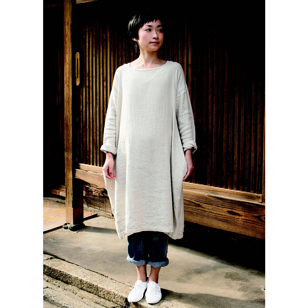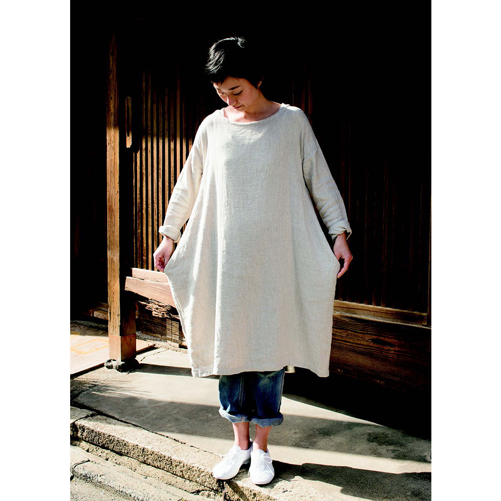 身頃とポケットが一体型になった、ちょっと不思議なシルエットのワンピース。少し立体的に飛び出るポケット部分がポイントです。作り方はイラストで丁寧に解説。分からないところはお電話やメールでの質問もOK。S/M/L/LLサイズを掲載。