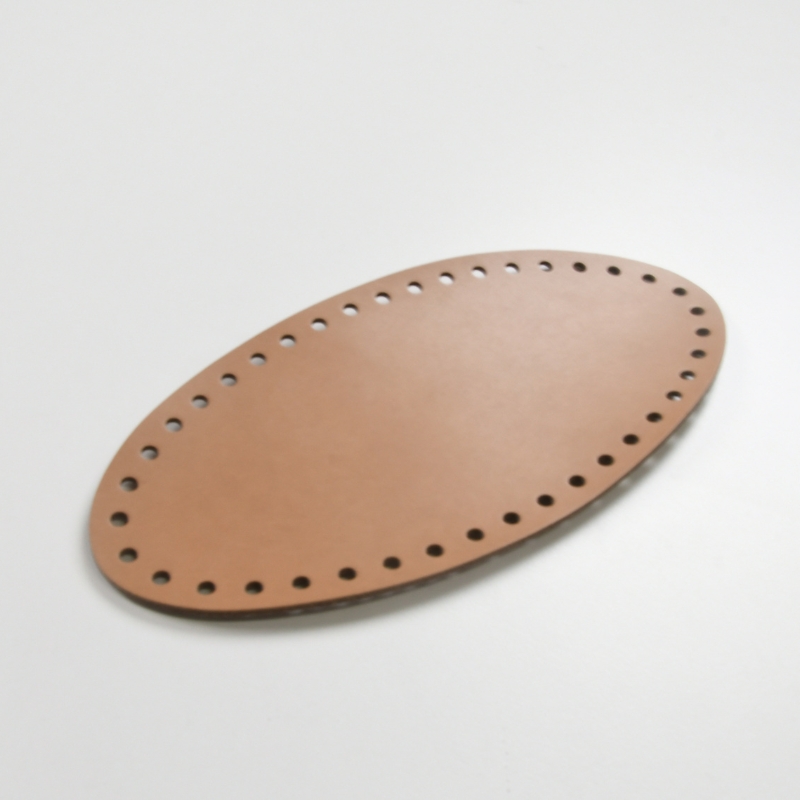 底は合皮製の楕円モチーフ。 周りにはひもを通す穴が40空いています。 楕円モチーフは合皮とは思えないほどしなやかな皮のような質感です。