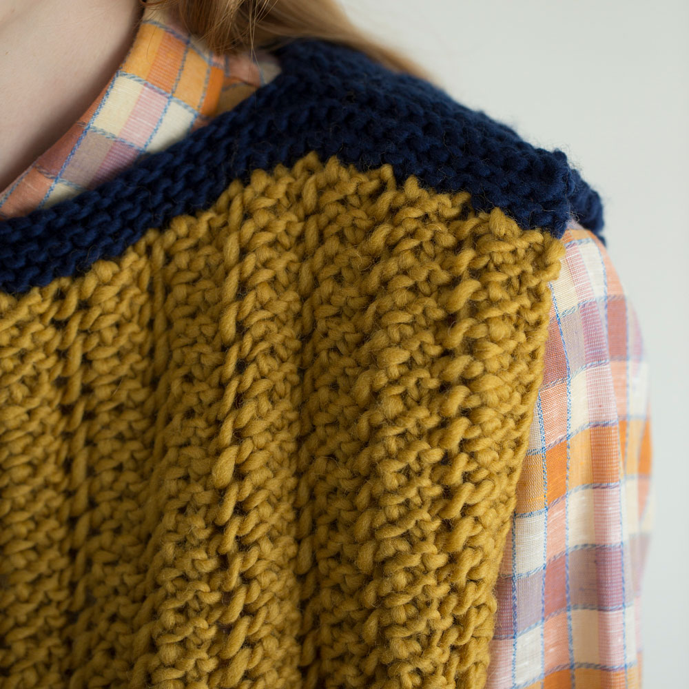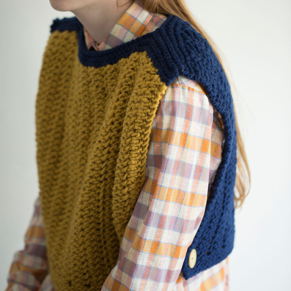 かけ目と2目一度の模様を毎段繰り返す、透かし模様で前後自由なバイカラーのベストに。「毎段操作」と聞くだけで難しそうに感じますが、編み方を文章で追っていくと意外とシンプル。太めの糸でザクザク編み進む、簡単かわいいベストです。