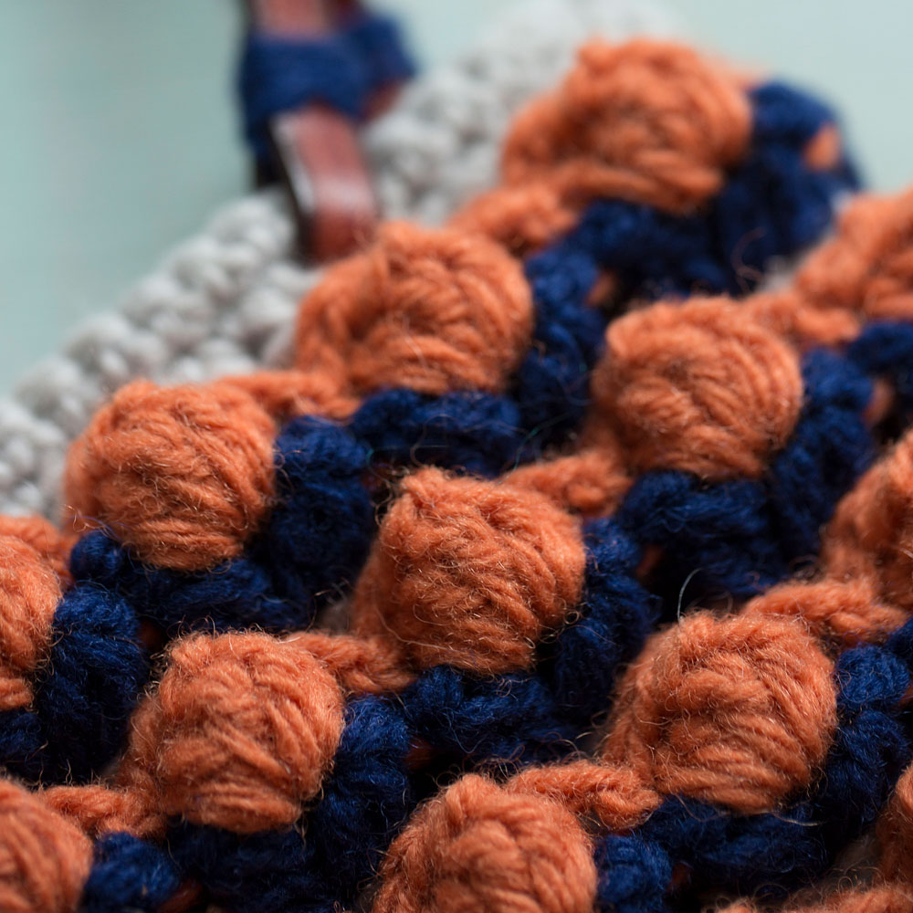 かぎ針で編むぼっぶるがお花畑のようなバッグ。アメリカ式の用語を使った文章パターンです。