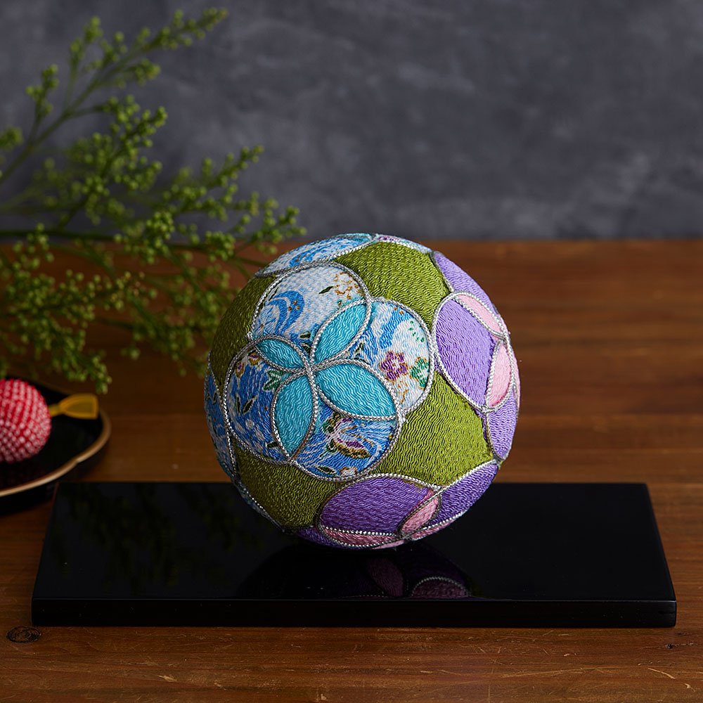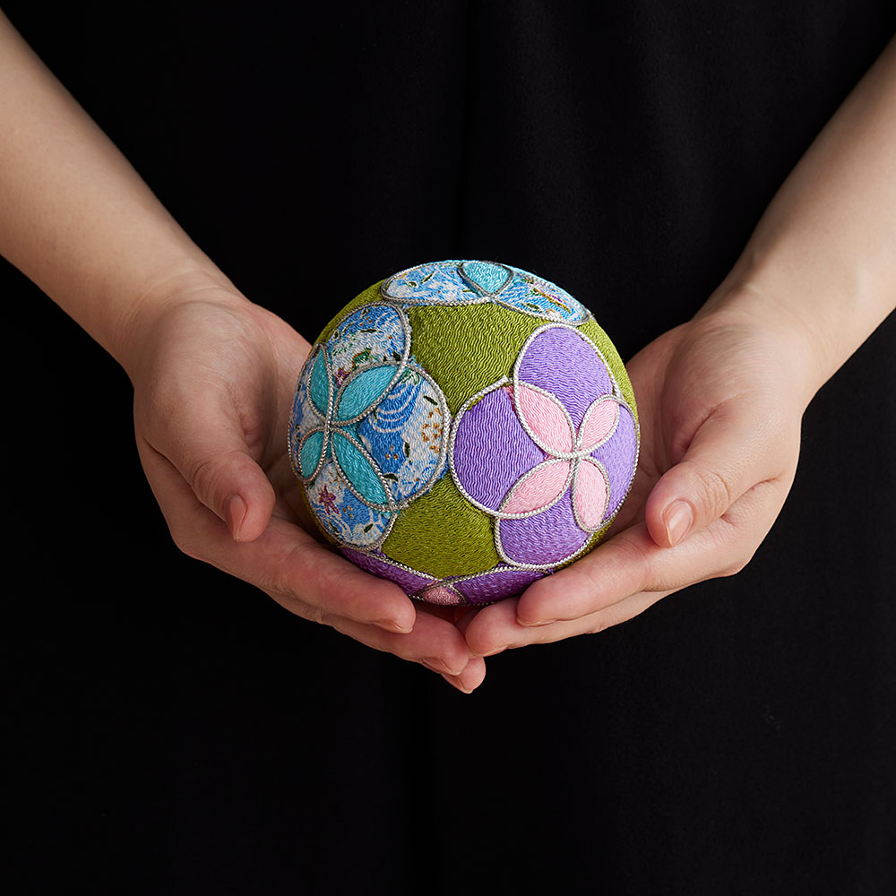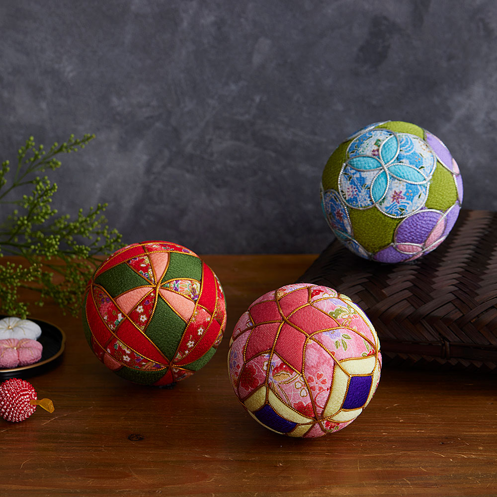 華やかで色鮮やかなちりめん生地を使った木目込みてまりのキット。型紙を土台に写すだけで簡単に柄が描け、美しい和の文様を楽しめます。