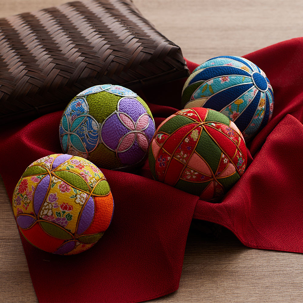 華やかで色鮮やかなちりめん生地を使った木目込みてまりのキット。型紙を土台に写すだけで簡単に柄が描け、美しい和の文様を楽しめます。