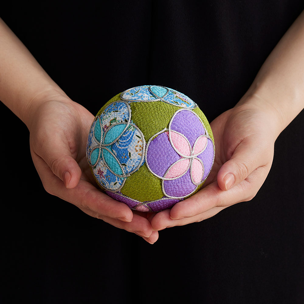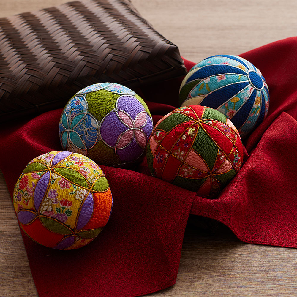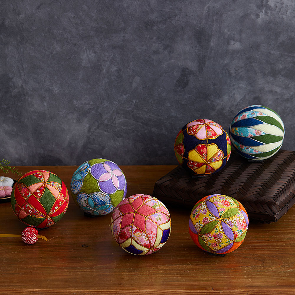 華やかで色鮮やかなちりめん生地を使った木目込みてまりのキット。型紙を土台に写すだけで簡単に柄が描け、美しい和の文様を楽しめます。