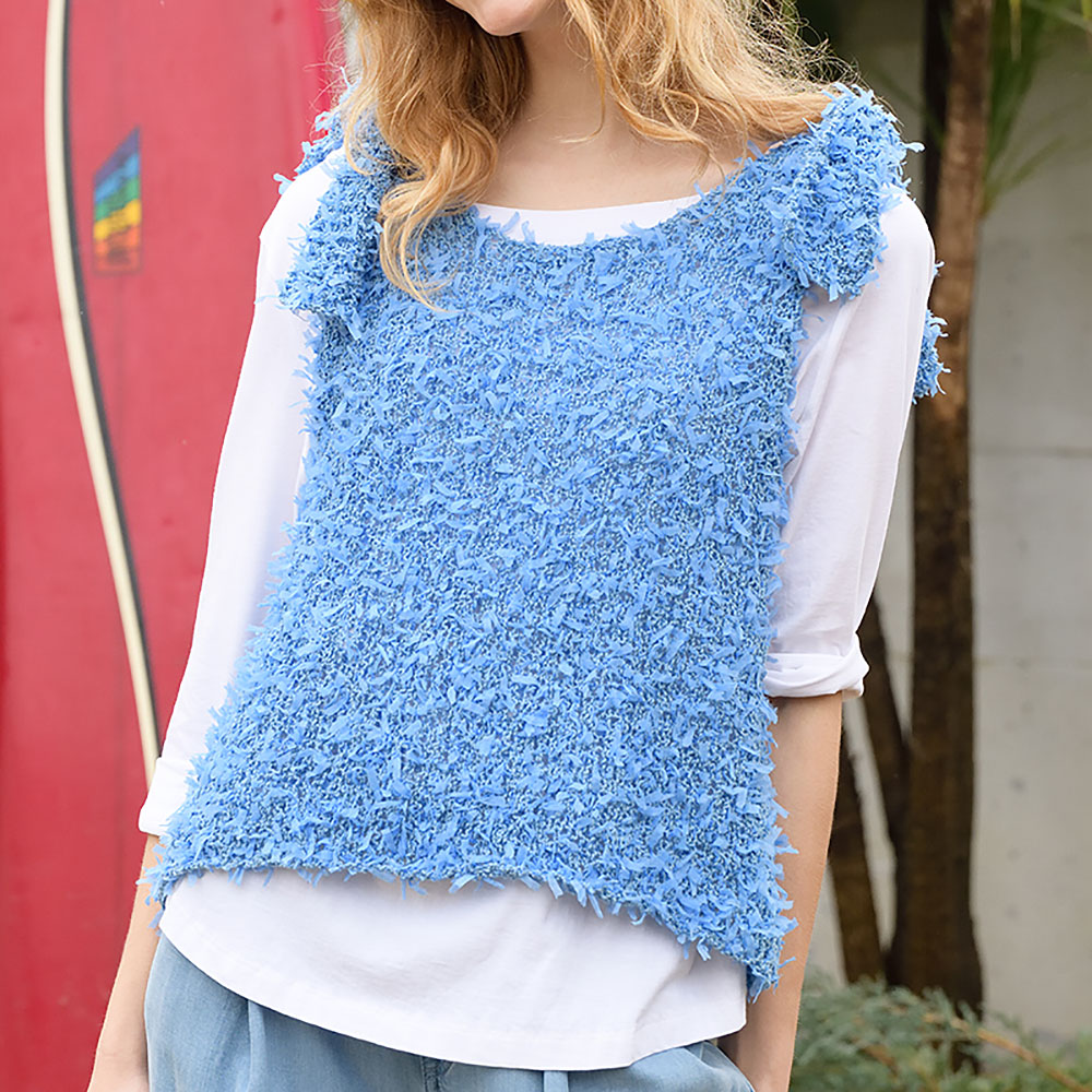 気軽に編めて遊び感覚で着られる肩リボンのベストはひらひらとした糸がとっても可愛い。目を落とさないようにだけ気をつければ、あとはとても簡単に、すぐに編めます。肩のリボンは結ぶ位置で印象が変わるので、お好みでどうぞ!