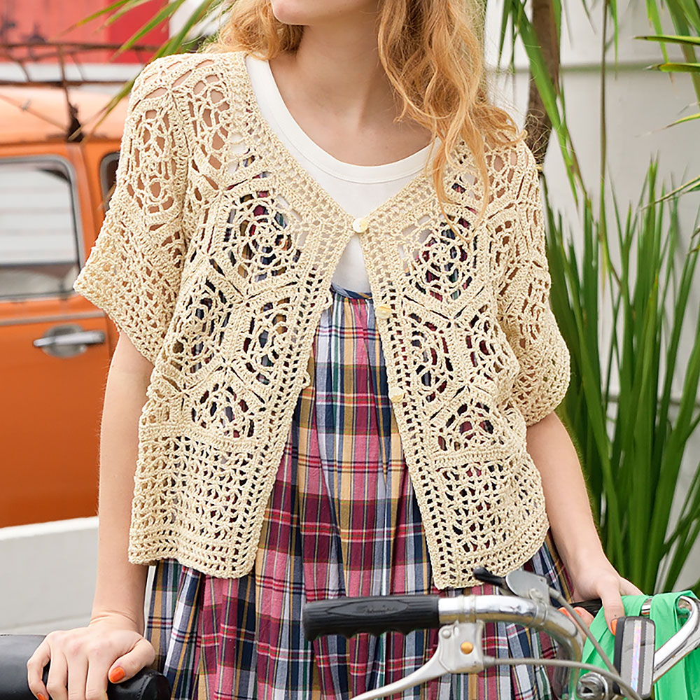 大きめの六角モチーフが目を惹くカーディガンは、地模様を太めのパネル状に組み合わせて、すっきりとまとめます。さりげなく色味とラメがミックスされた糸で編んでいるので、ちょっとドレッシーなスタイリングにもマッチします。