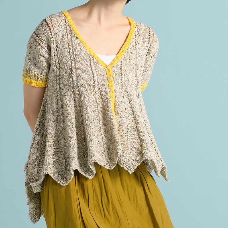 たっぷりとした編み地のカーディガンは後ろ下がりのシルエットが可愛い。ナチュラルカラーに鮮やかな黄色がアクセントになっています。