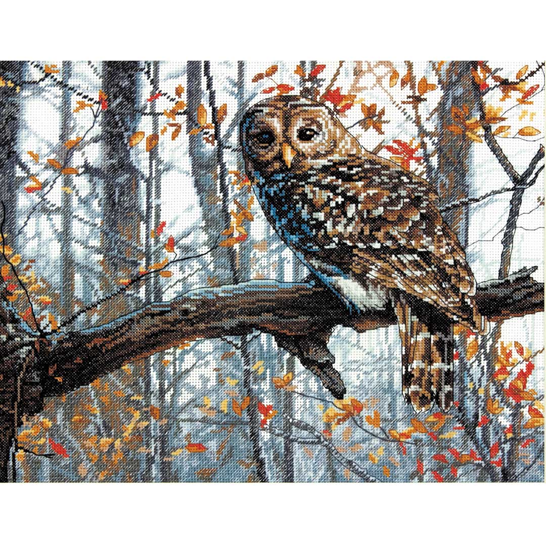 【キット作り方つき】木の枝で羽を休めるフクロウを、リア ルに表現したクロスステッチ作品です。語りかけるような優しいまなざしが印象的。上級の方にお勧めです。アメリカ・Dimensions社製