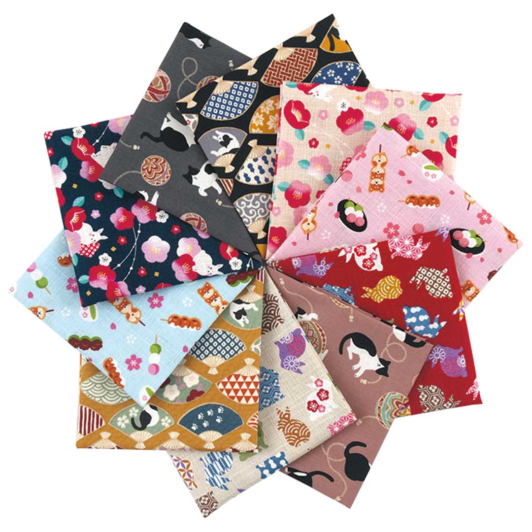 [シーチング・ドビー]ハチワレと扇や手まり、ウサギと梅など、可愛らしい和柄モチーフのカットクロスセット。小物作りなどにおすすめ。