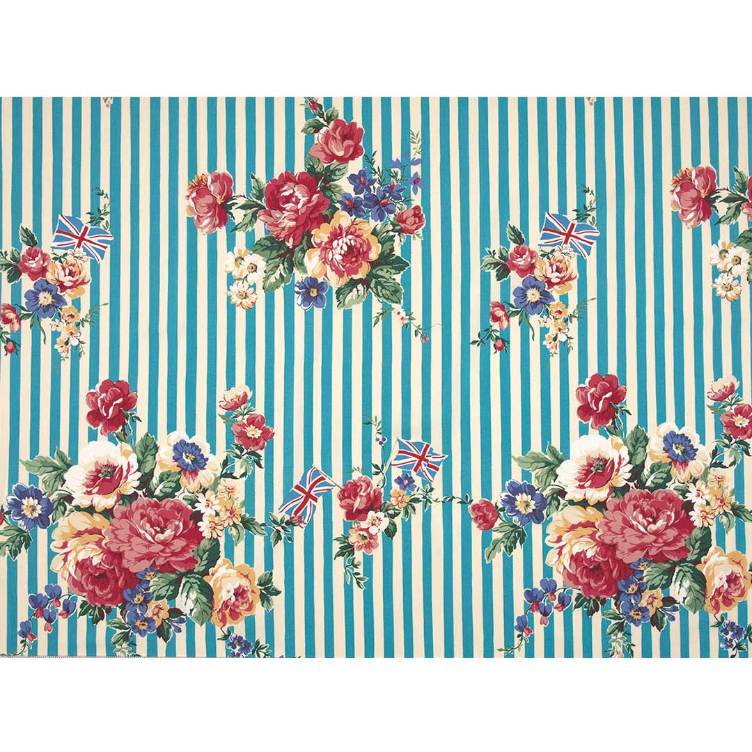 岡本洋子さんデザイン。約1cm幅のストライプに、大きなフラワーブーケを描いたインパクトのあるデザイン。ユニオンジャックもポイントです。