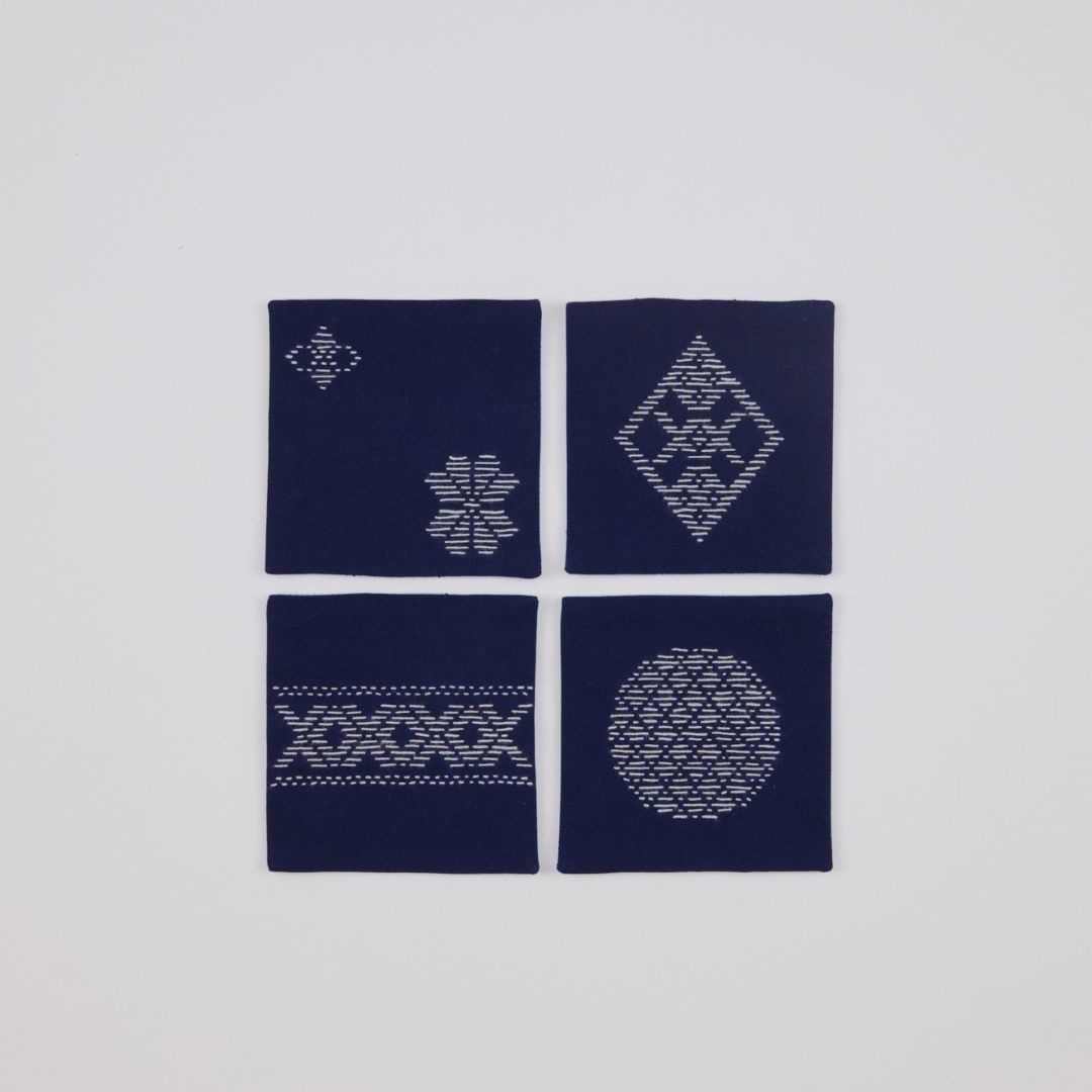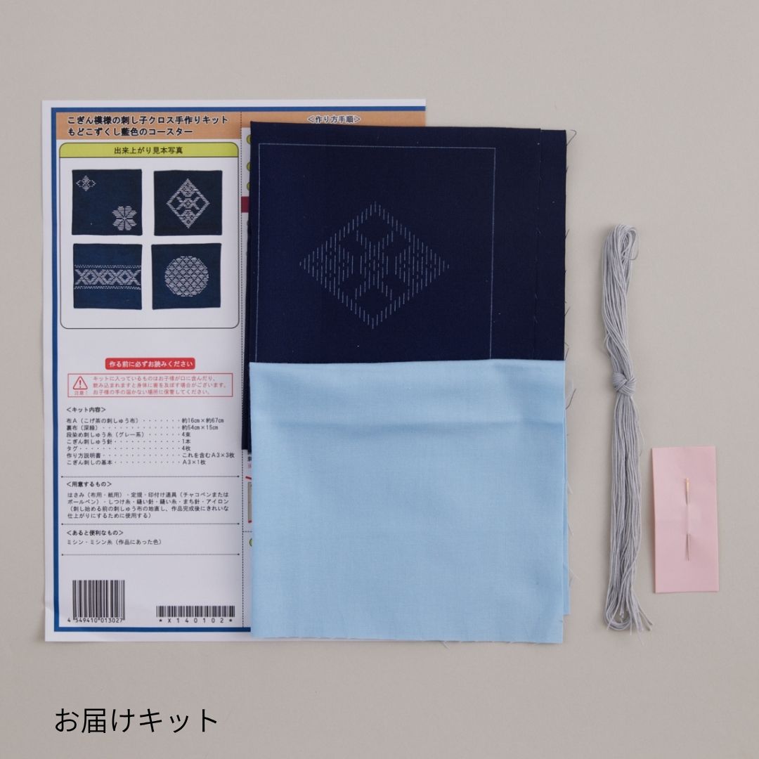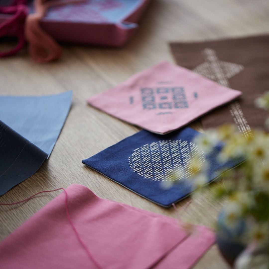 「こぎん刺し」は本来、布の織り目を数えながら刺し進めて模様を作る技法ですが、本キットでは、下絵が印刷された布になみ縫いの「刺し子」の技法で縫い進めていくことで、こぎんの伝統文様を気軽に楽しめるようになっています。