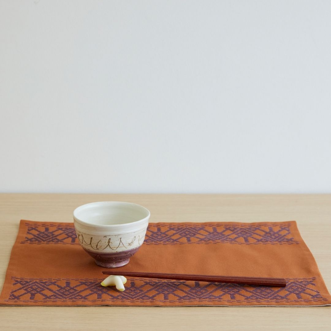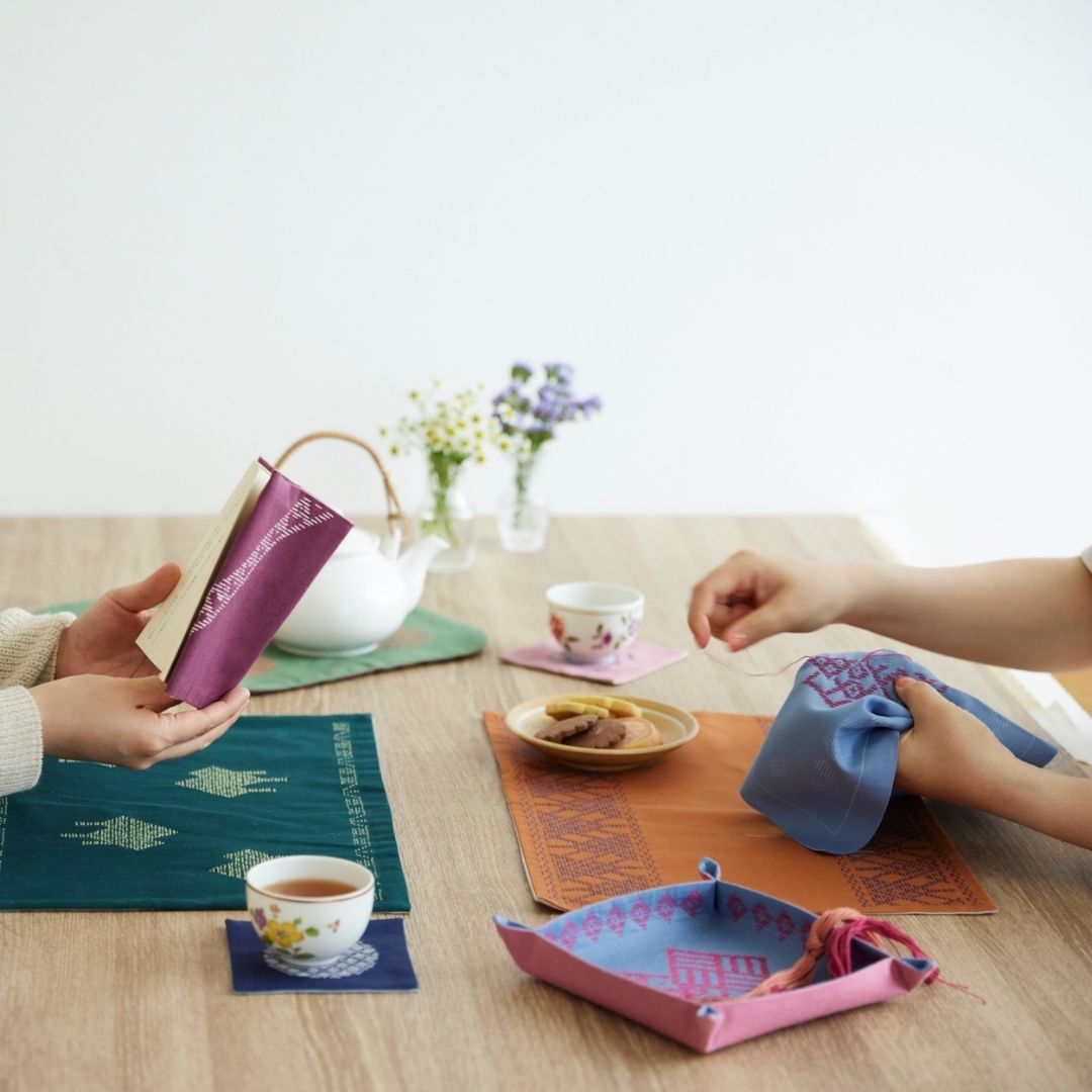 「こぎん刺し」は本来、布の織り目を数えながら刺し進めて模様を作る技法ですが、本キットでは、下絵が印刷された布になみ縫いの「刺し子」の技法で縫い進めていくことで、こぎんの伝統文様を気軽に楽しめるようになっています。