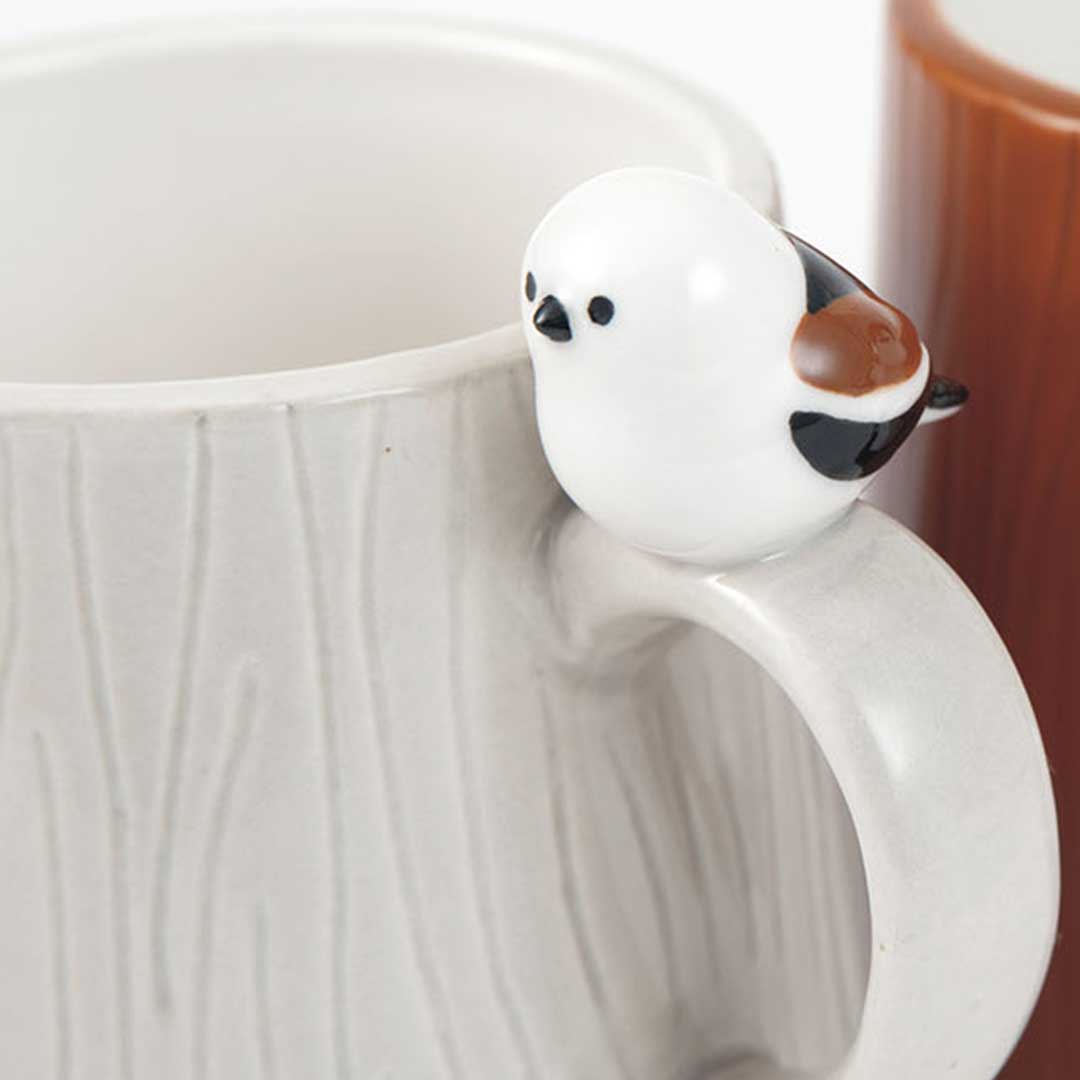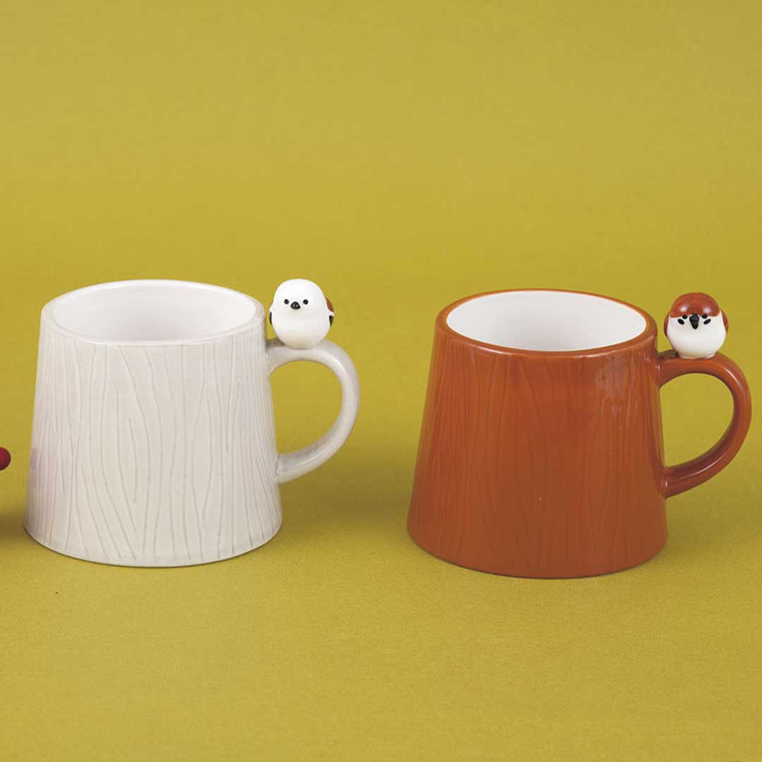 【完成品】目が合うたびに思わず微笑んでしまう愛らしさ。人気の小鳥がとまった切り株モチーフのマグカップ2種です!