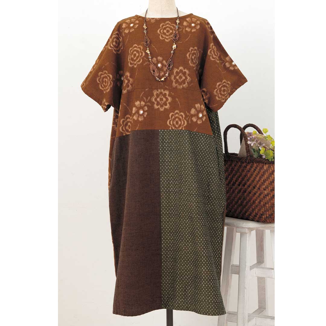 【限定10】【完成品】しっとりした色合いの布を組み合わせた、上品な和モダンワンピース。両面どちらを前にしても着られます。左右にポケットつき。