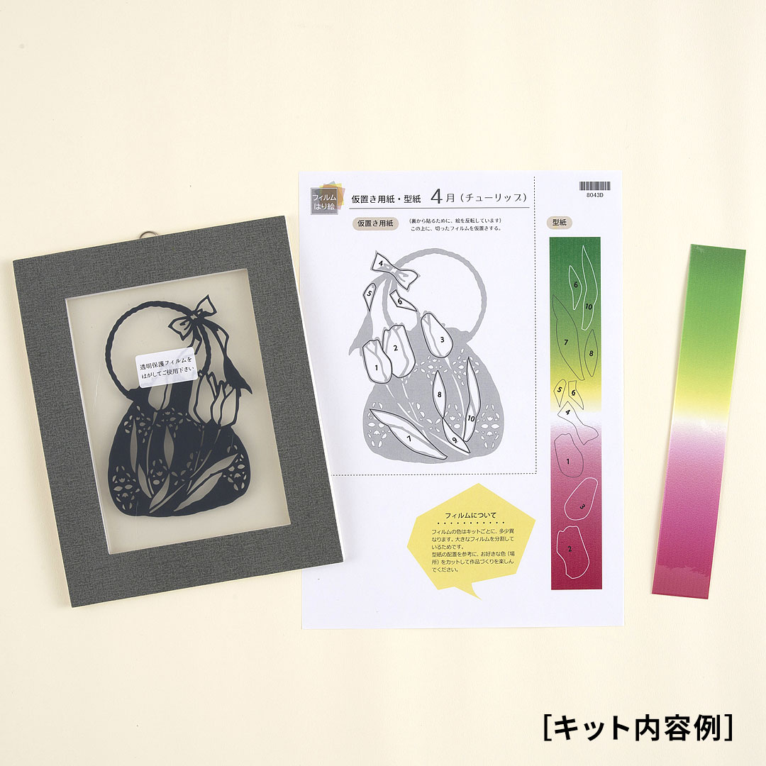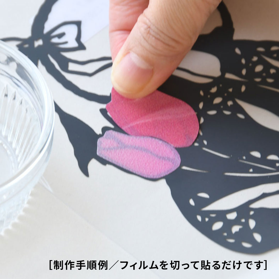 デザイン画が印刷された樹脂板にカラーフィルムを切って貼るだけで、繊細な切り絵作品が完成します。