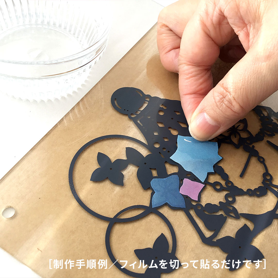 デザイン画が印刷された樹脂板にカラーフィルムを切って貼るだけで、繊細な切り絵作品が完成します。