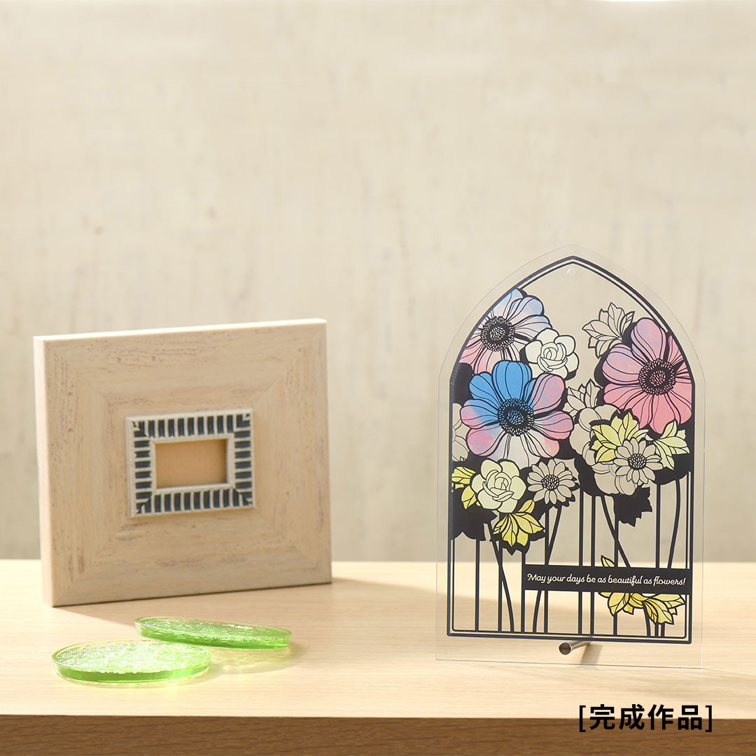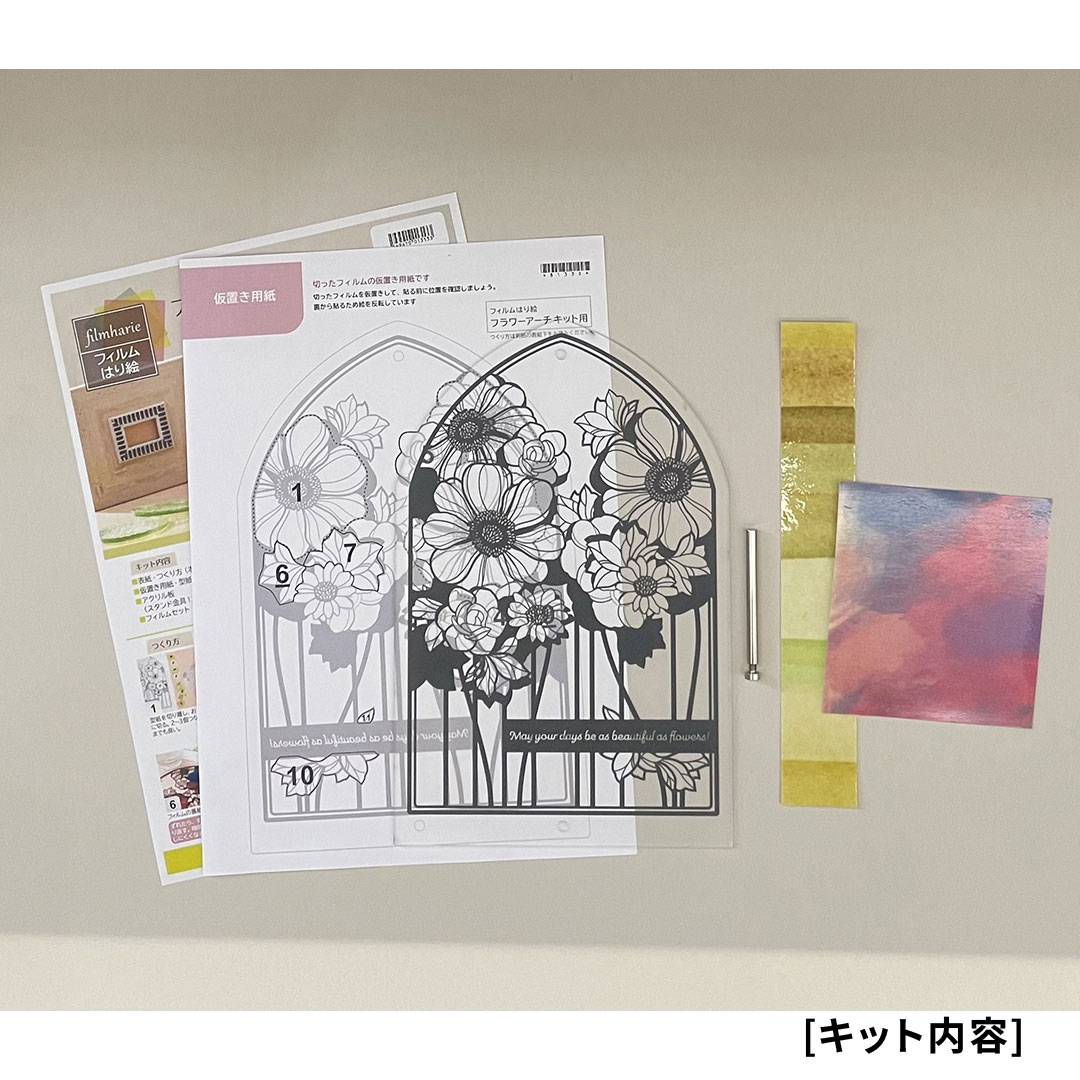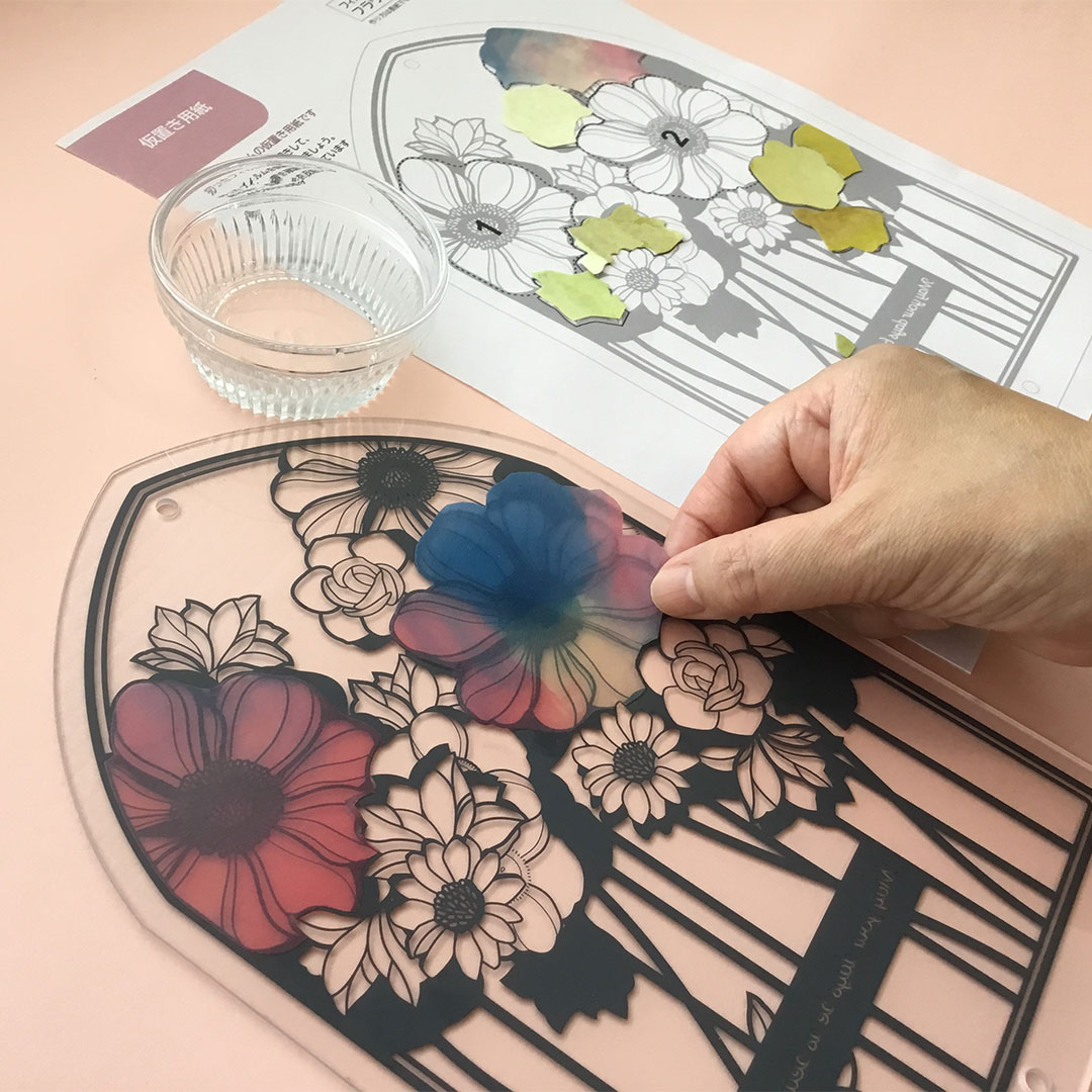 デザイン画が印刷された樹脂板にカラーフィルムを切って貼るだけで、繊細な切り絵作品が完成します。