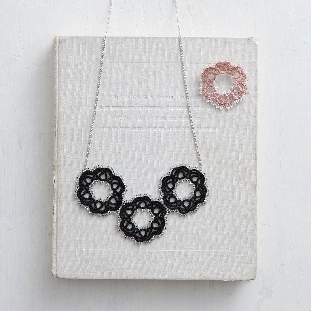 ヨーロッパから伝わる優雅で上品なレース編み、タティングレース。もっとも細い40番のレース糸を使い、ビーズを通して編み込んでつくるブローチとネックレス。