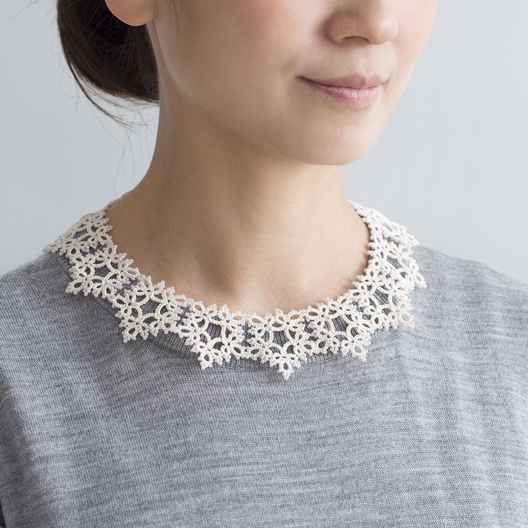 タティングレースの魅力にあふれたつけ衿。モチーフの縁にはビーズを編み込みました。Tシャツなどシンプルな衿元を華やかにしてくれます。