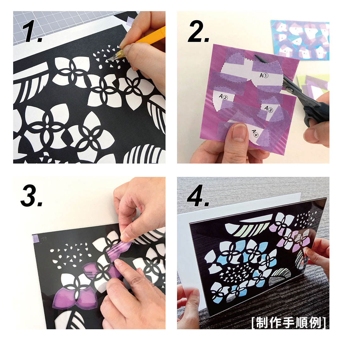 透明板に図案どおりにカットしたアート紙を挟み、カラーフィルムを水で貼ります。