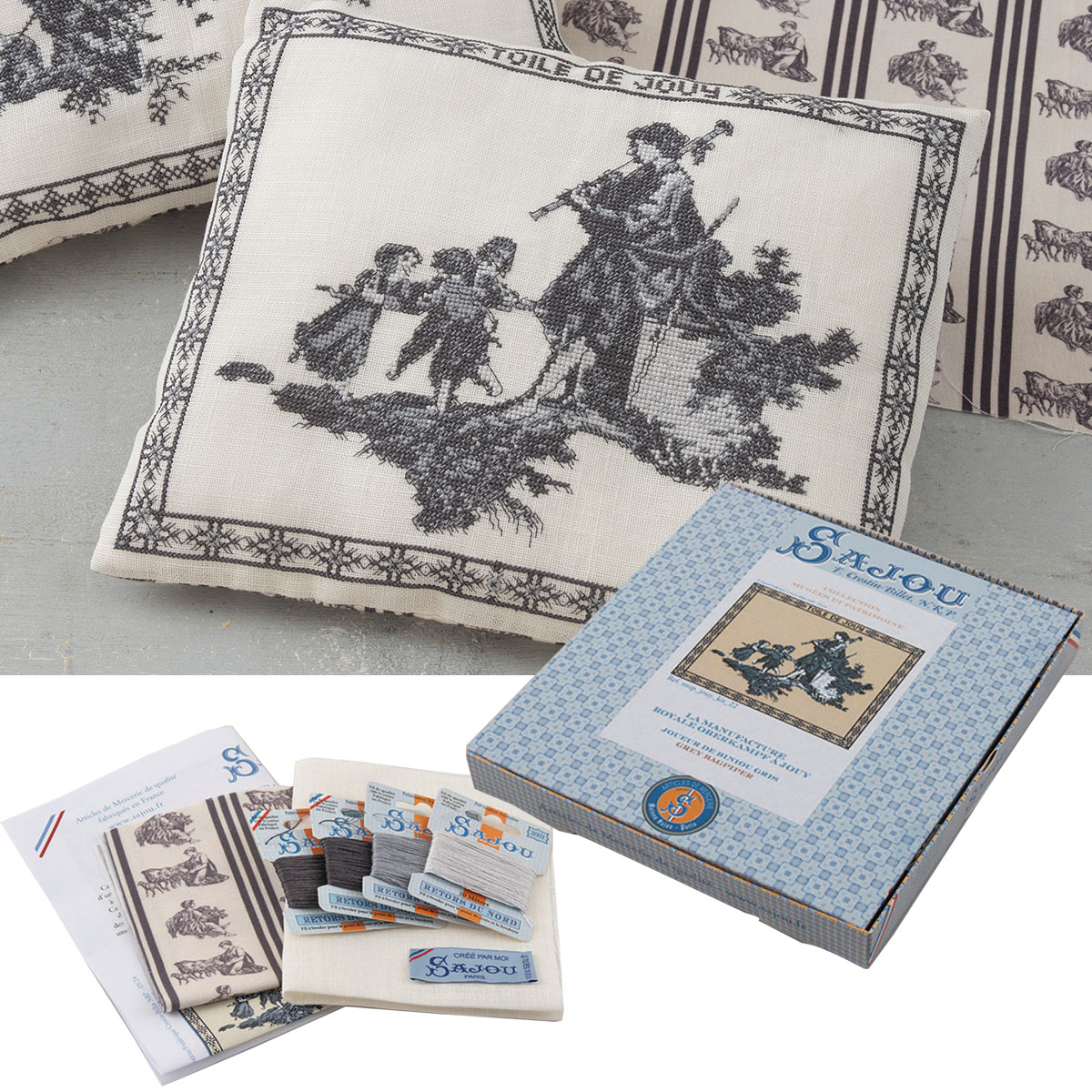 【限定10】18世紀に製作されたトワルドジュイのプリント柄「L‘Offrande a l`amour(愛への捧げ物)」のモチーフをクロスステッチして、クッションに仕立てられるキット。裏面にはサジューオリジナルプリント布を使用します。パリから届いたばかりの新商品。            「ビニウ」はバグパイプの一種で、周りには音色に合わせて踊る子どもたちが描かれています。