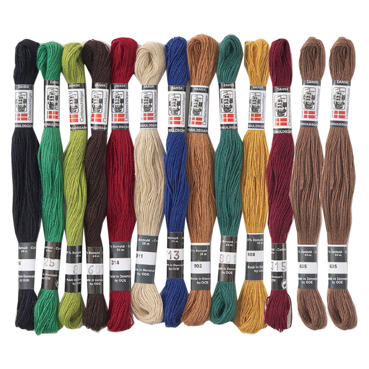 デンマークの老舗刺しゅうメーカー、O.Oehlenschlagers Eftr.Aps社(オーレンシュレーガー・通称OOE)の花糸。15ページ掲載の作品に使用した糸セットです。つやのない自然で素朴な色味と風合いが特徴です。1本撚りなのでそのまま刺しゅうすることができます。