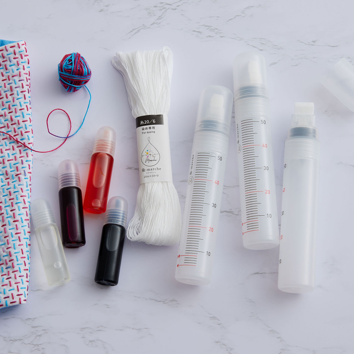 液体染料(チェリーレッド、アクアブルー、ムーンイエロー)各10ml、カラーフィット(色止め液)10ml、染-marche 糸20/6 20m×3かせ(1束)、染-marche イージーライナー3本、作り方説明書