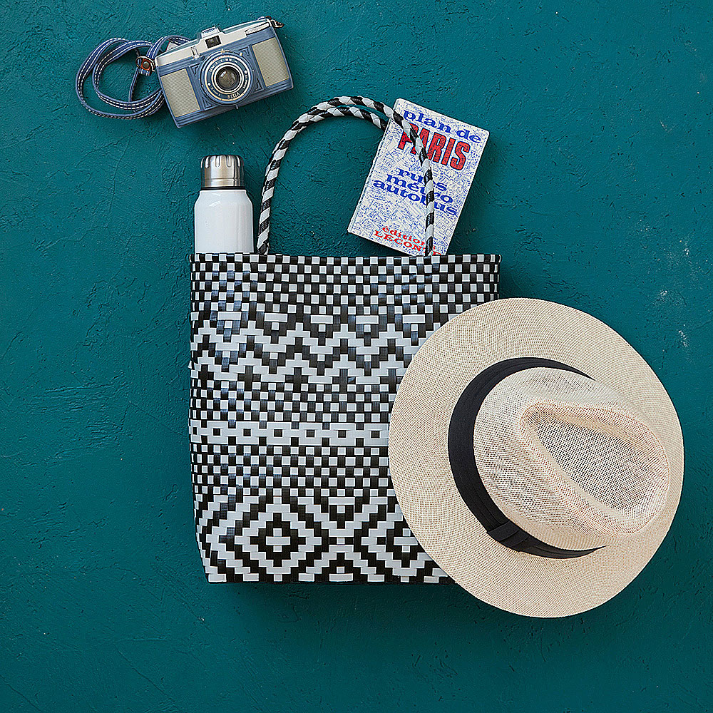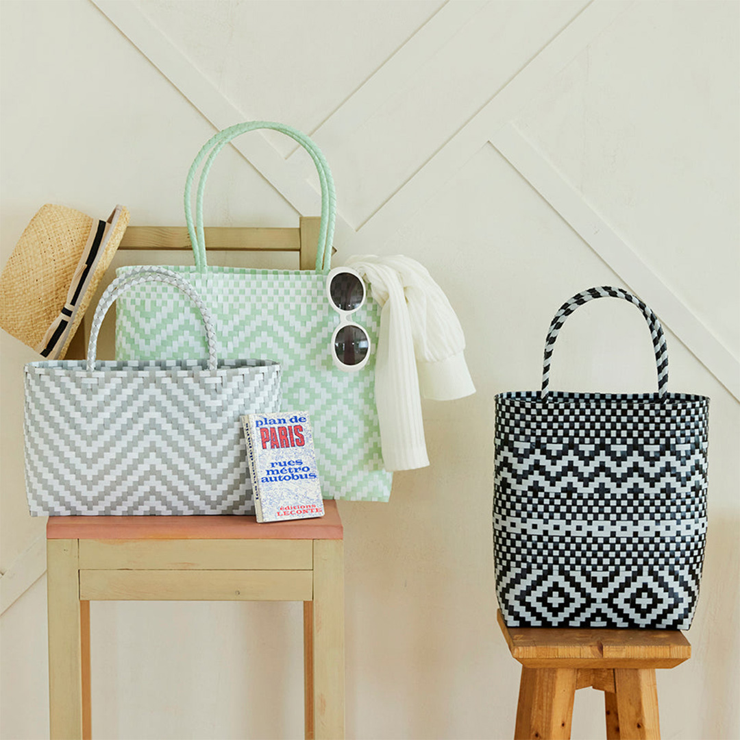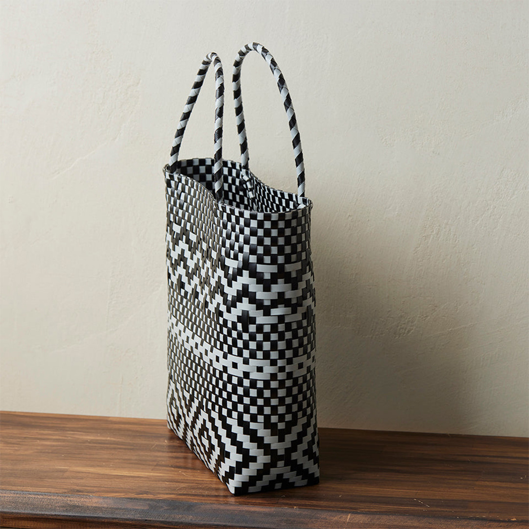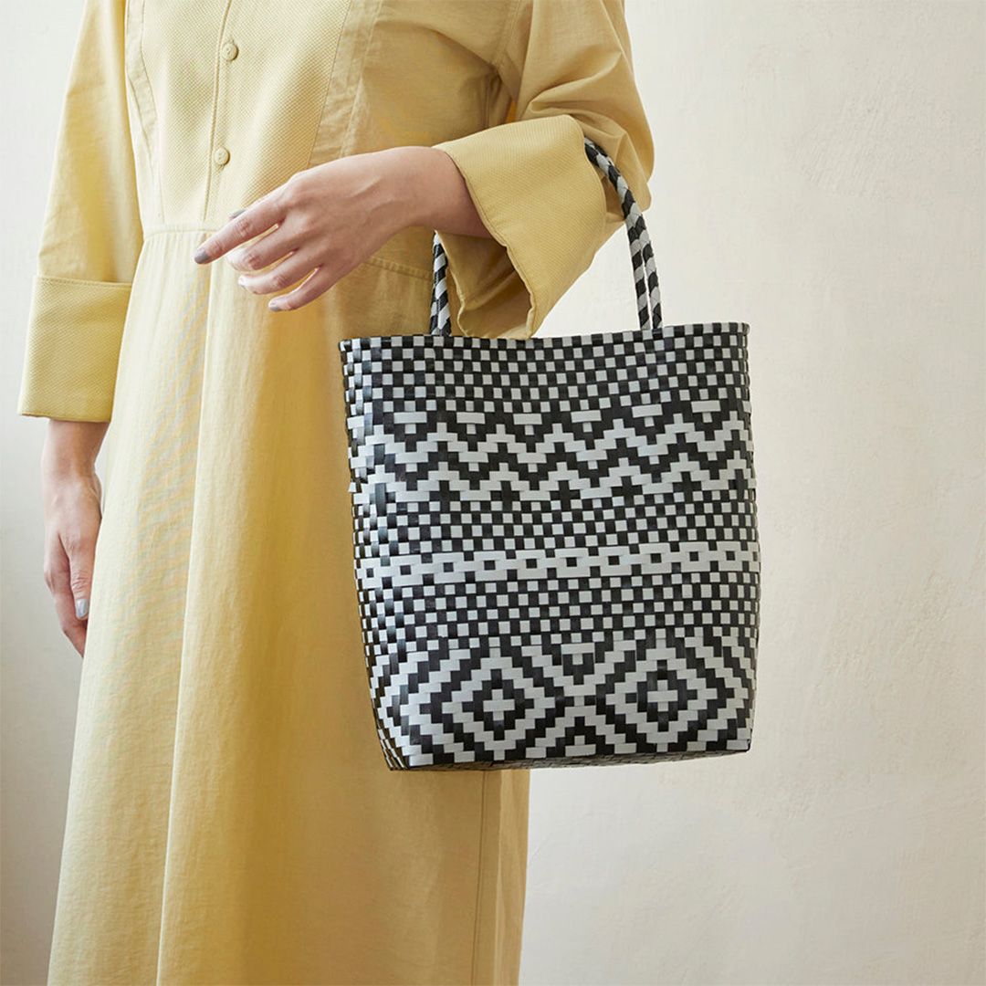 小桝網代編みで編みや市松模様などを組み合わせたおしゃれなバッグは、普段使いに活躍しそう。黒白のプラカゴテープで編んだ模様は目を引きます。