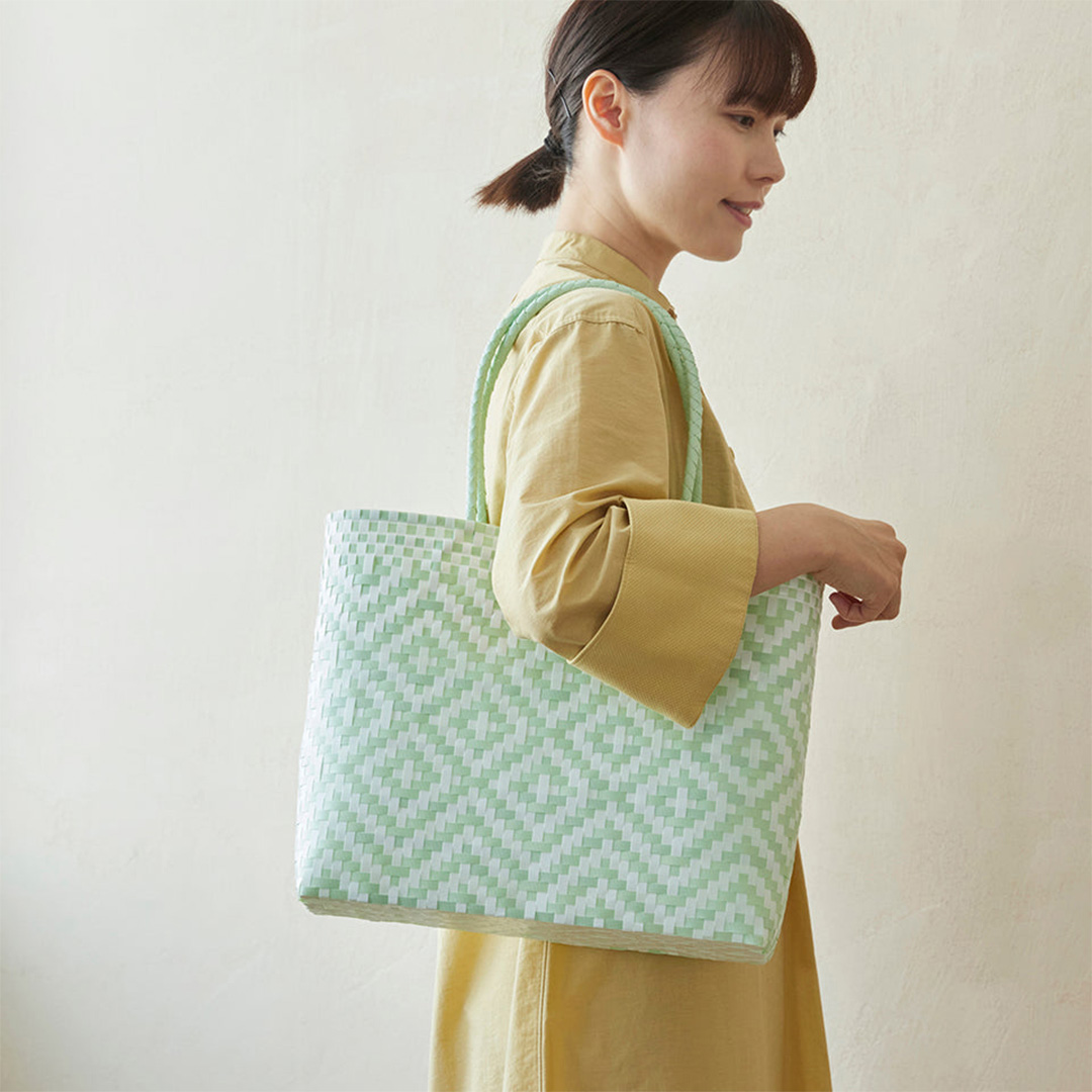 底から小桝網代編みで編んでいくツートンカラーのかごバッグは、お買いにもピクニックにも重宝する少し大きめのサイズです。